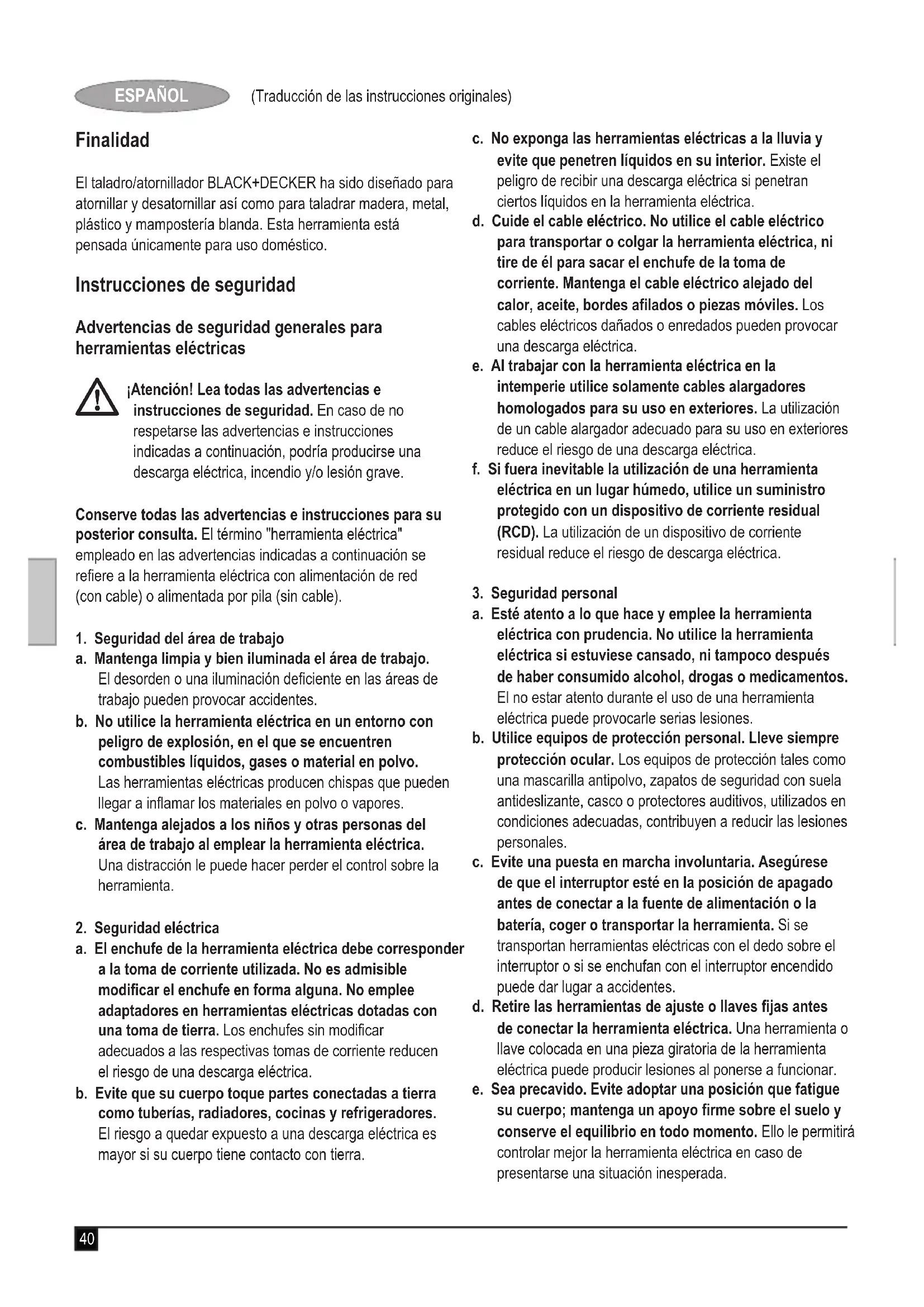 Si el cable electrico está estropeado, debe ser sustituido por el fabricante o un service Tecnico autorizzato de BLACK+DECKER con el fin de evaporar accidentes.