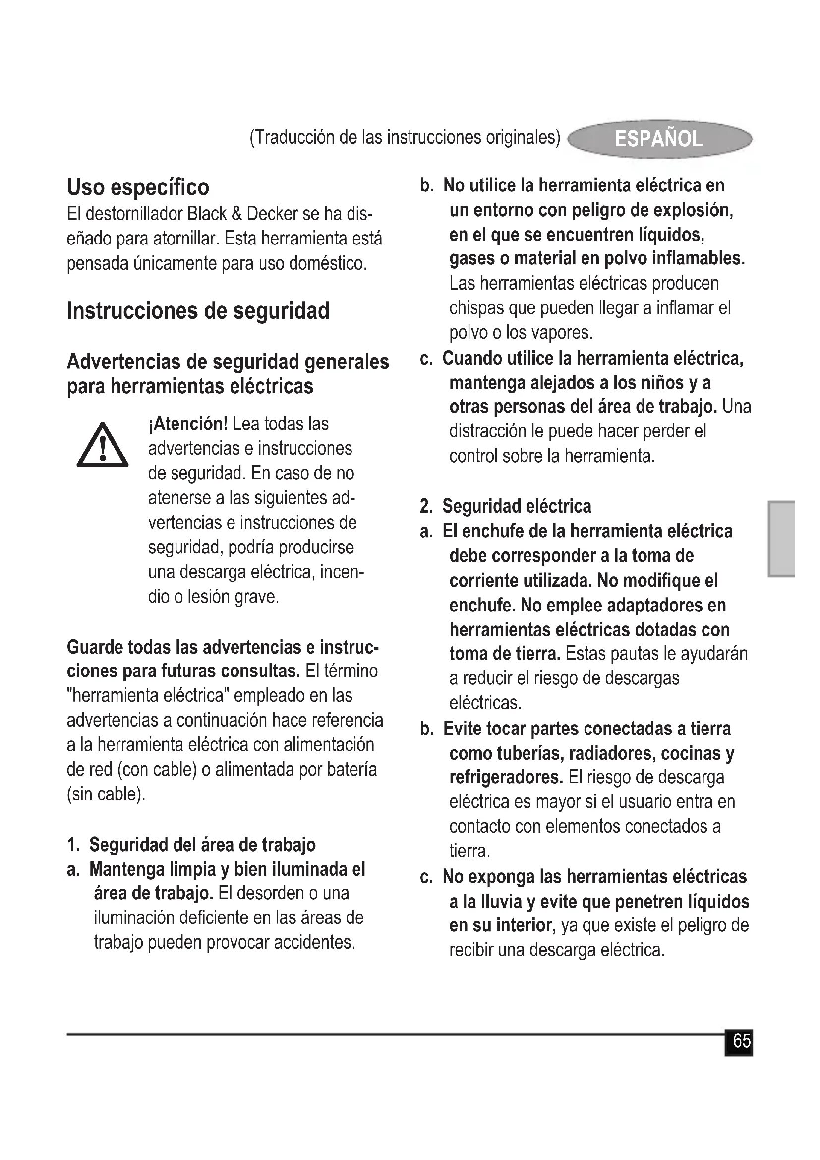 Kevin Hewitt Vicepresidente de Ingeniería global Black & Decker Europe, 210 Bath Road, Slough, Berkshire, SL1 3YD Reino Unido 28/05/201377 (Traducción de las instrucciones originales) ESPAÑOL Garantía Black & Decker confía plenamente en la cali- dad de sus productos y ofrece una garantía extraordinaria. Esta declaración de garantía es un añadido, y en ningún caso un perjuicio para sus derechos legales. La garantía es válida dentro de los territorios de los Estados miembros de la Unión Europea y de los de la Zona Europea de Libre Comercio. Si un producto Black & Decker resultara defectuoso debido a materiales o mano de obra defectuosos o a la falta de conformidad, Black & Decker garantiza, dentro de los 24 meses de la fecha de compra, la sustitución de las piezas defectuosas, la reparación de los productos sujetos a un desgaste y rotura razonables o la sustitución de tales productos para garantizar al cliente el mínimo de incon- venientes, a menos que: u El producto se ha utilizado con propósitos comerciales, profesionales o de alquiler. u El producto se ha sometido a un uso inadecuado o negligente. u El producto ha sufrido daños causados por objetos o sustancias extrañas o ac- cidentes. u Se hayan realizado reparaciones por parte de personas que no sean del servicio técnico autorizado o personal de servicios de Black & Decker. Para reclamar en garantía, será necesa- rio que presente la prueba de compra al vendedor o al agente de servicio técnico autorizado. Puede consultar la dirección de su agente de servicio técnico más cercano si se pone en contacto con la ocina local de Black & Decker en la dirección que se indica en este manual. Como opción alternativa, puede consultar la lista de los agentes de servicio técnico autorizados de Black & Decker y obtener la información completa de nuestros servicios de posventa y los contactos dis- ponibles en la siguiente dirección de Internet: www.2helpU.com Visite el sitio web www.blackanddecker. es para registrar su nuevo producto Black & Decker y estar al día sobre productos y ofertas especiales. Encontrará información adicional sobre la marca Black & Decker y nuestra gama de productos en www.black- anddecker.es.78 (Tradução das instruções originais) PORTUGUÊS Utilização prevista A sua aparafusadora Black & Decker foi concebida para aplicações de aparafusa- mento. Esta ferramenta destina-se apenas a utilização doméstica. Instruções de segurança Avisos de segurança gerais para fer- ramentas eléctricas