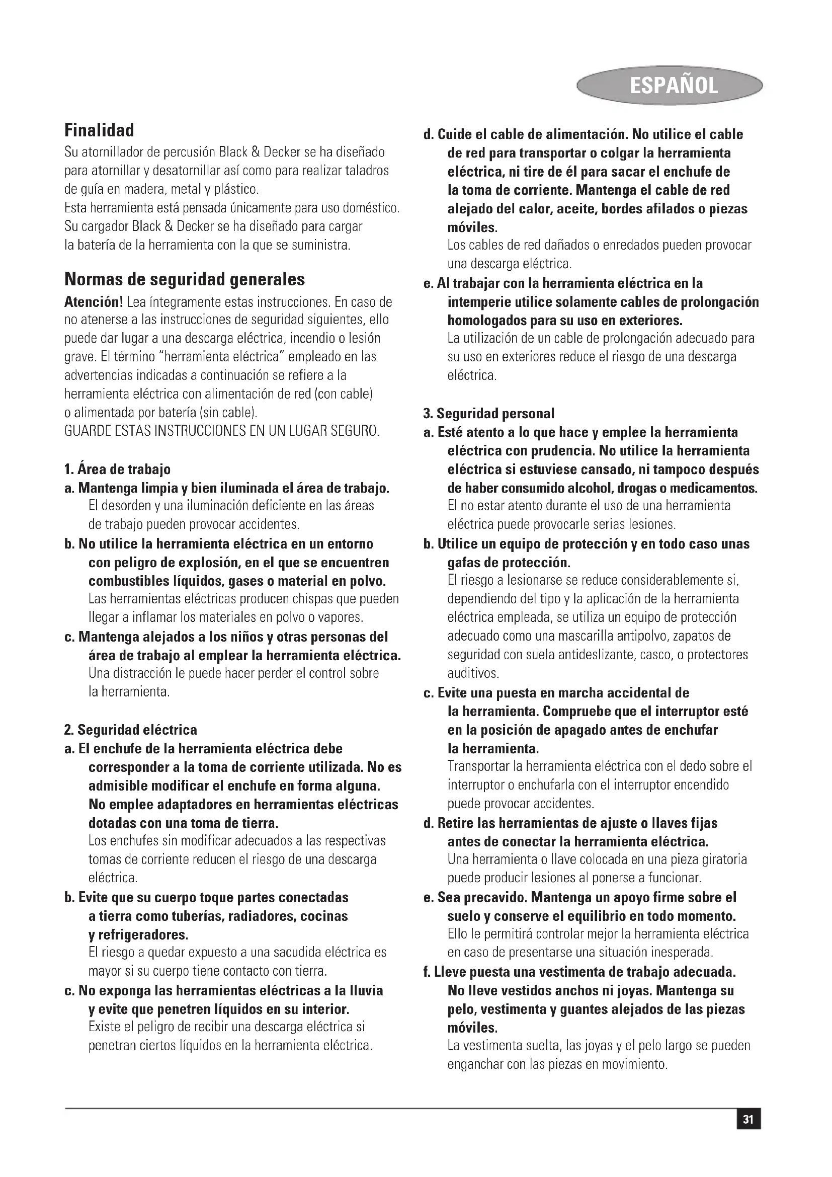(incertidumbre de potencia acústica) 3 dB(A) Kevin Hewitt Director de Ingeniería del Consumidor Spennymoor, County Durham DL16 6JG, Reino Unido 1-6-2006 Garantía Black & Decker confía plenamente en la calidad de sus productos y ofrece una garantía extraordinaria. Esta declaración de garantía es una añadido, y en ningún caso un perjuicio para sus derechos estatutarios. La garantía es válida dentro de los territorios de los Estados Miembros de la Unión Europea y de los de la Zona Europea de Libre Comercio. Si un producto Black & Decker resultará defectuoso debido a materiales o mano de obra defectuosos o a la falta de conformidad, Black & Decker garantiza, dentro de los 24 meses de la fecha de compra, la sustitución de las piezas defectuosas, la reparación de los productos sujetos a un desgaste y rotura razonables o la sustitución de tales productos para garantizar al cliente el mínimo de inconvenientes, a menos que:36 ESPAÑOL ◆ El producto haya sido utilizado con propósitos comerciales, profesionales o de alquiler; ◆ El producto haya sido sometido a un uso inadecuado o negligente; ◆ El producto haya sufrido daños causados por objetos o sustancias extrañas o accidentes; ◆ Se hayan realizado reparaciones por parte de personas que no sean los servicios de reparación autorizados o personal de servicios de Black & Decker; Para reclamar en garantía, será necesario que presente la prueba de compra al vendedor o al servicio técnico de reparaciones autorizado. Pueden consultar la dirección de su servicio técnico más cercano poniéndose en contacto con la oficina local de Black & Decker en la dirección que se indica en este manual. Como alternativa, se puede consultar en Internet, en la dirección siguiente, la lista de servicios técnicos autorizados e información completa de nuestros servicios de postventa y contactos: www.2helpU.com Visite nuestro sitio web www.blackanddecker.com para registrar su nuevo producto Black & Decker y mantenerse al día sobre nuestros productos y ofertas especiales. Encontrará información adicional sobre la marca Black & Decker y nuestra gama de productos en www.blackanddecker.com37 PORTUGUÊS Utilização O aparafusador de percussão da Black & Decker foi projectado para aparafusar e fazer orifícios guia em madeira, metal e plástico. O carregador Black & Decker foi desenvolvido para carregar a bateria da ferramenta com a qual ele foi fornecido. Esta ferramenta destina-se apenas ao doméstico. Regras gerais de segurança Advertência! Leia todas as instruções. O não cumprimento das instruções a seguir podem causar choque eléctrico, incêndio e/ou graves lesões. O termo “ferramenta eléctrica” utilizado a seguir refere-se a ferramentas eléctricas com ligação à corrente eléctrica (com cabo) ou operadas a bateria (sem fios). GUARDE BEM ESTAS INSTRUÇÕES.
