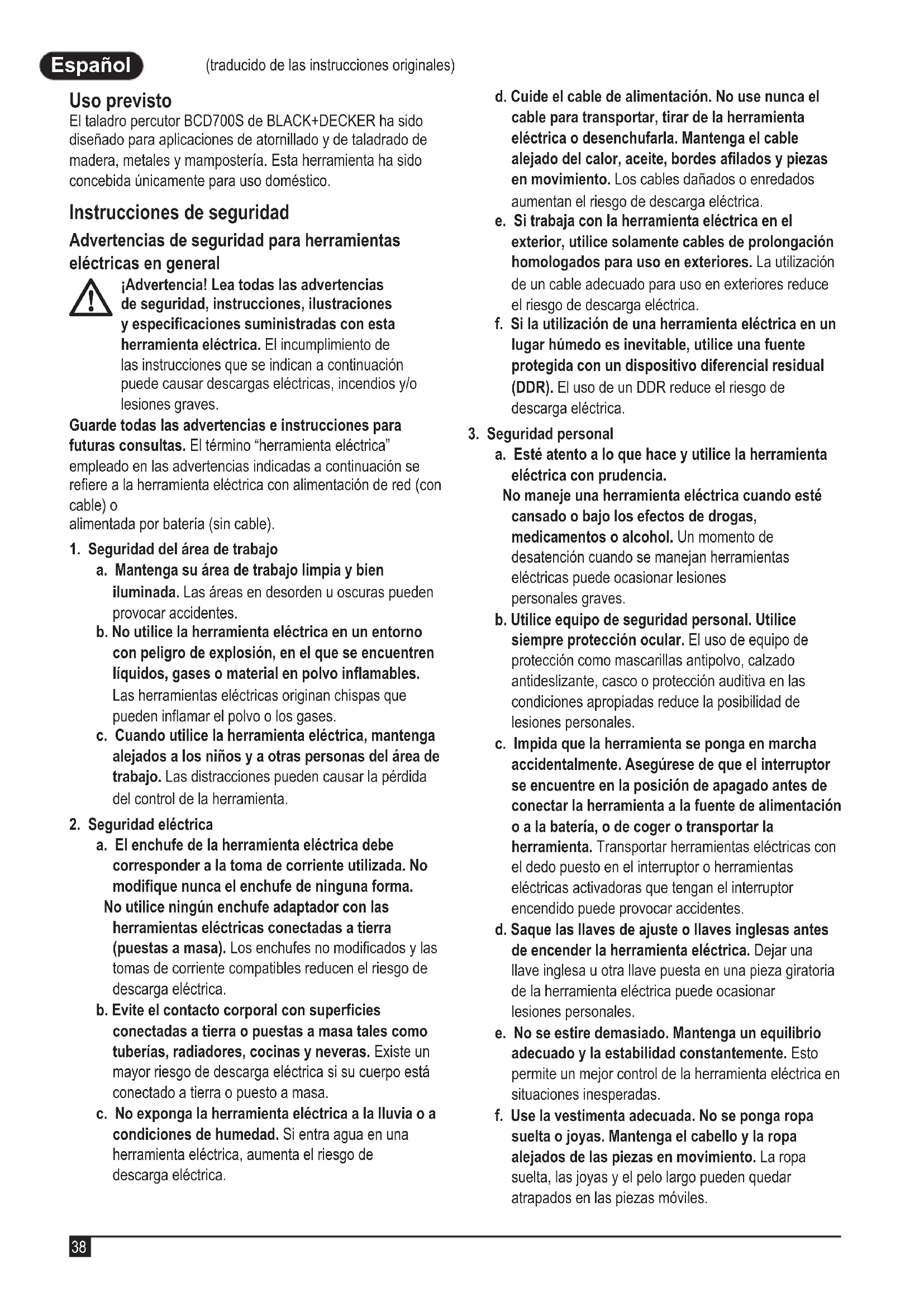 (traducido de las instrucciones originales) Español (traducido de las instrucciones originales) Uso previsto El taladro percutor BCD700S de BLACK+DECKER ha sido diseñado para aplicaciones de atornillado y de taladrado de madera, metales y mampostería. Esta herramienta ha sido concebida únicamente para uso doméstico. Instrucciones de seguridad Advertencias de seguridad para herramientas eléctricas en general