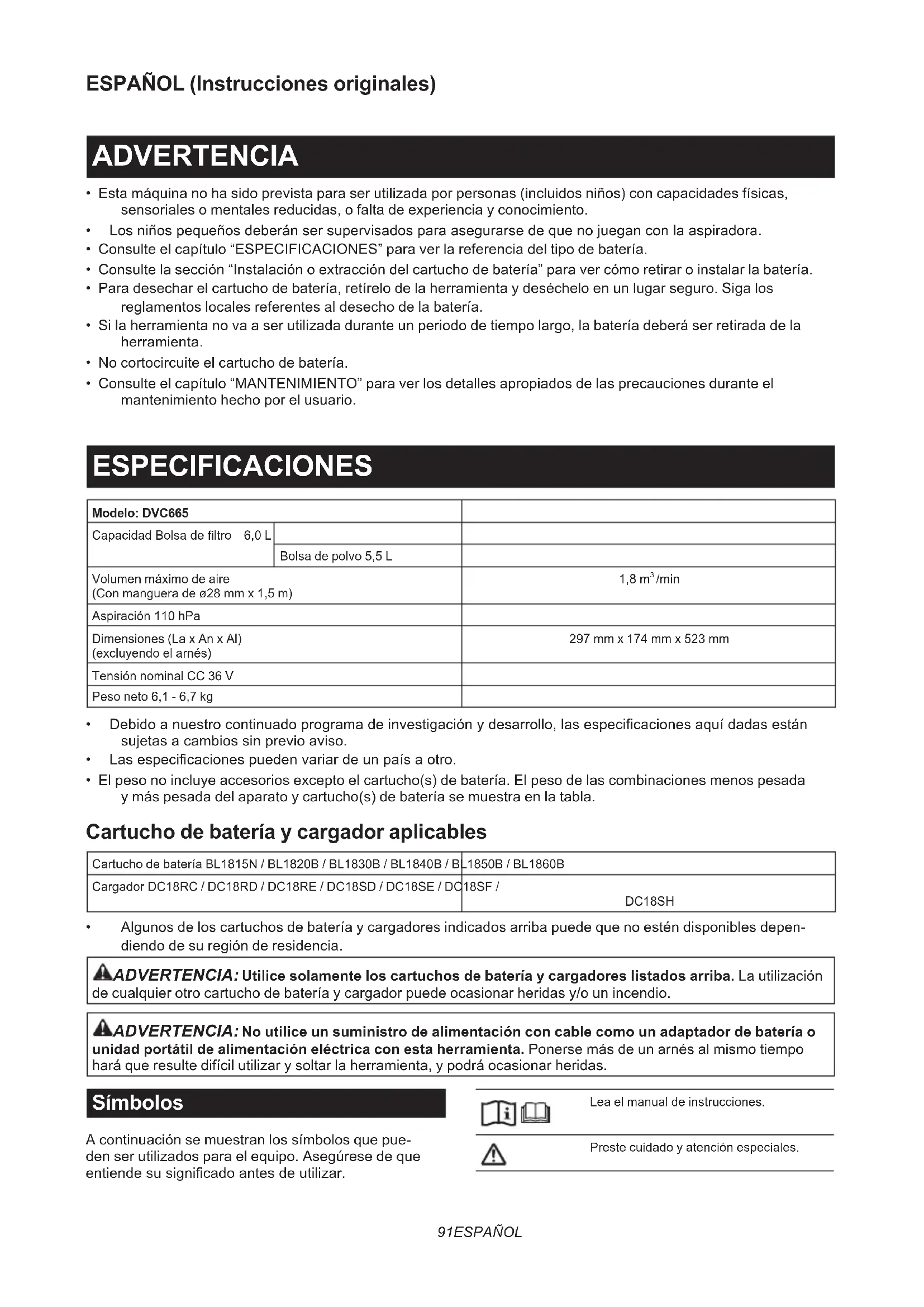 - Algunos de los cartuchos de batería y cargadores indicados arriba puede que no estén disponibles depen- diendo de su región de residencia. ADVERTENCIA: Utilice solamente los cartuchos de batería y cargadores listados arriba. La utilización de cualquier otro cartucho de batería y cargador puede ocasionar heridas y/o un incendio. ADVERTENCIA: No utilice un suministro de alimentación con cable como un adaptador de batería o unidad portátil de alimentación eléctrica con esta herramienta. Ponerse más de un arnés al mismo tiempo hará que resulte difícil utilizar y soltar la herramienta, y podrá ocasionar heridas. Símbolos A continuación se muestran los símbolos que pue- den ser utilizados para el equipo. Asegúrese de que entiendesusignicadoantesdeutilizar. Lea el manual de instrucciones. Preste cuidado y atención especiales.92 ESPAÑOL Ni-MH Li-ion Sólo para países de la Unión Europea Debido a la presencia de componentes peligrosos en el equipo, el equipo eléctrico y electrónico, los acumuladores y las baterías desechados pueden tener un impacto negativo para el medioambiente y la salud humana. ¡No tire los aparatos eléctricos y electróni- cosnilasbateríasjuntoconlosresiduos domésticos! De conformidad con las Directivas Europeas sobre residuos de aparatos eléctricos y electrónicos y sobre acumu- ladores y baterías y residuos de acumula- dores y baterías, así como la adaptación de las mismas a la ley nacional, el equipo eléctrico, las baterías y los acumuladores desechados deberán ser almacenados por separado y trasladados a un punto distinto de recogida de desechos municipales, que cumpla con los reglamentos sobre protec- ción medioambiental. Esto se indica mediante el símbolo de cubo de basura tachado colocado en el equipo. Uso previsto El aparato ha sido previsto para recoger polvo seco. El aparatoesapropiadoparausocomercial,porejemplo, en hoteles, escuelas, hospitales, fábricas, tiendas, ocinasynegociosdealquiler. Ruido El nivel de ruido A-ponderado típico determinado de acuerdo con la norma IEC60335-2-69, IEC60704-2-1: Nivel de presión sonora (L