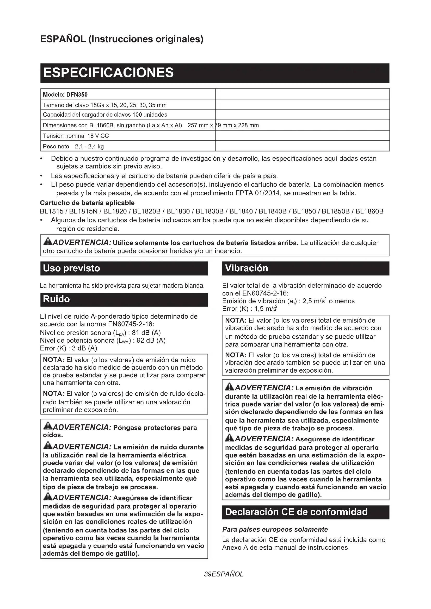 NOTA:Elvalor(olosvalores)totaldeemisiónde vibracióndeclaradohasidomedidodeacuerdocon unmétododepruebaestándarysepuedeutilizar para comparar una herramienta con otra. NOTA:Elvalor(olosvalores)totaldeemisiónde vibracióndeclaradotambiénsepuedeutilizarenuna valoración preliminar de exposición. ADVERTENCIA: La emisión de vibración durante la utilización real de la herramienta eléc- trica puede variar del valor (o los valores) de emi- sión declarado dependiendo de las formas en las que la herramienta sea utilizada, especialmente qué tipo de pieza de trabajo se procesa. ADVERTENCIA: Asegúrese de identicar medidas de seguridad para proteger al operario que estén basadas en una estimación de la expo- sición en las condiciones reales de utilización (teniendo en cuenta todas las partes del ciclo operativo como las veces cuando la herramienta está apagada y cuando está funcionando en vacío además del tiempo de gatillo). Declaración CE de conformidad Para países europeos solamente LadeclaraciónCEdeconformidadestáincluidacomo AnexoAdeestamanualdeinstrucciones.40 ESPAÑOL ADVERTENCIAS DE SEGURIDAD Advertencias de seguridad para herramientas eléctricas en general ADVERTENCIA: Lea todas las advertencias de seguridad, instrucciones, ilustraciones y espe- cicaciones provistas con esta herramienta eléc- trica. Si no sigue todas las instrucciones indicadas abajopodráresultarenunadescargaeléctrica,un incendioy/oheridasgraves. Guarde todas las advertencias e instrucciones para futuras referencias. Eltérmino“herramientaeléctrica”enlasadvertencias sereereasuherramientaeléctricadefunciona- mientoconconexiónalaredeléctrica(concable)o herramientaeléctricadefuncionamientoabatería(sin cable). Advertencias de seguridad para la clavadora inalámbrica