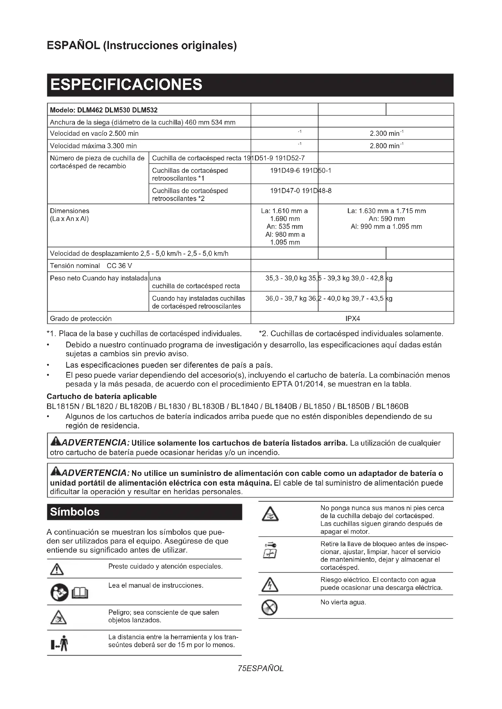 - Batería y cargador genuinos de Makita NOTA: Algunos elementos de la lista podrán estar incluidos en el paquete del producto como accesorios estándar. Pueden variar de un país a otro.89 PORTUGUÊS PORTUGUÊS (Instruções originais) ESPECIFICAÇÕES Modelo: DLM462 DLM530 DLM532 Largura do corte de relva (diâmetro da lâmina) 460 mm 534 mm Velocidade em vazio 2.500 min