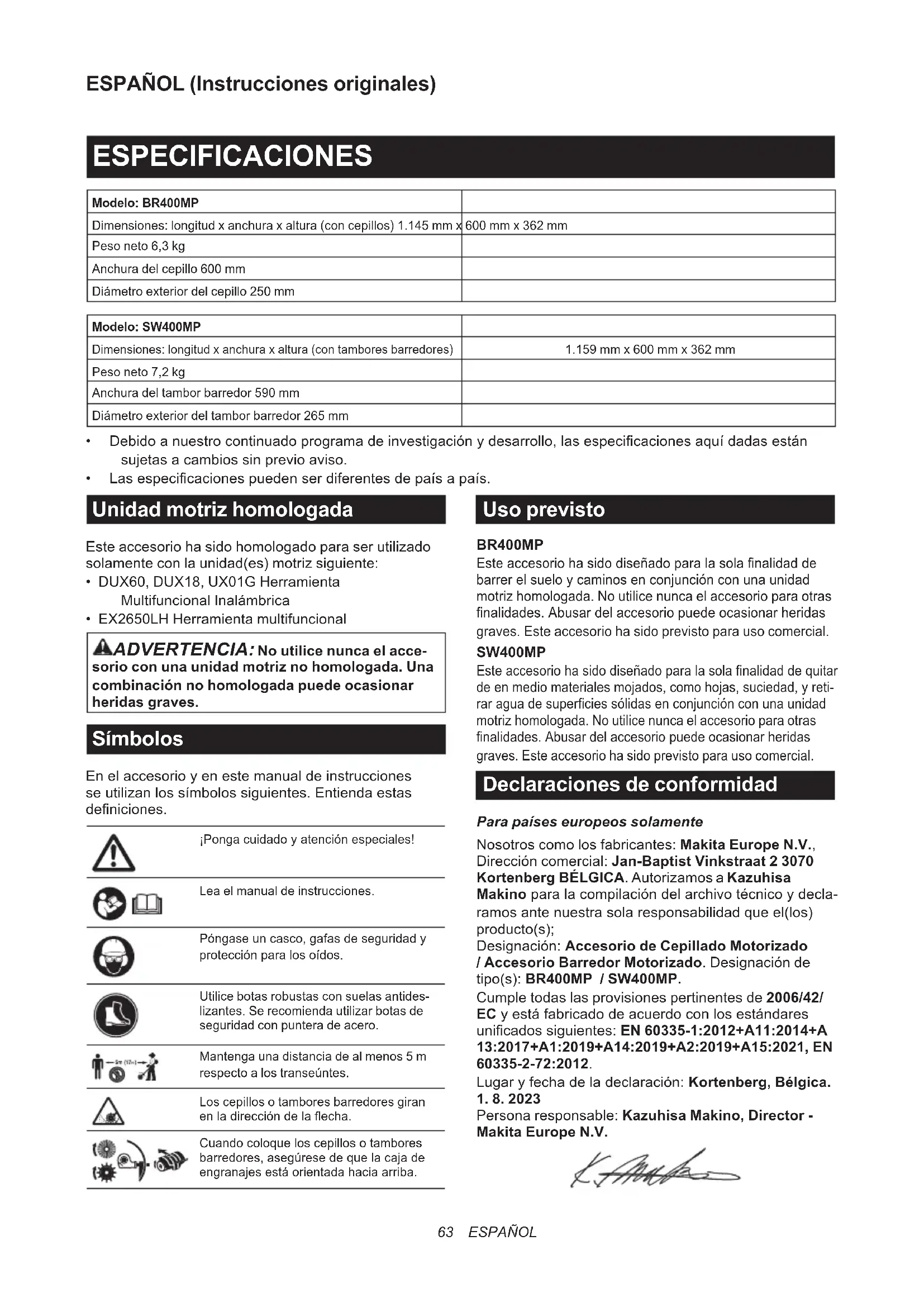 - EX2650LH Herramienta multifuncional ADVERTENCIA: No utilice nunca el acce- sorio con una unidad motriz no homologada. Una combinación no homologada puede ocasionar heridas graves. Símbolos Enelaccesorioyenestemanualdeinstrucciones seutilizanlossímbolossiguientes.Entiendaestas deniciones. ¡Pongacuidadoyatenciónespeciales! Lea el manual de instrucciones. Póngaseuncasco,gafasdeseguridady protecciónparalosoídos. Utilice botas robustas con suelas antides- lizantes. Se recomienda utilizar botas de seguridad con puntera de acero. Mantenga una distancia de al menos 5 m respecto a los transeúntes. Los cepillos o tambores barredores giran enladireccióndelaecha. Cuandocoloqueloscepillosotambores barredores,asegúresedequelacajade engranajesestáorientadahaciaarriba. Uso previsto BR400MP Esteaccesoriohasidodiseñadoparalasolanalidadde barrerelsueloycaminosenconjunciónconunaunidad motriz homologada. No utilice nunca el accesorio para otras nalidades.Abusardelaccesoriopuedeocasionarheridas graves. Este accesorio ha sido previsto para uso comercial. SW400MP Esteaccesoriohasidodiseñadoparalasolanalidaddequitar deenmediomaterialesmojados,comohojas,suciedad,yreti- raraguadesuperciessólidasenconjunciónconunaunidad motriz homologada. No utilice nunca el accesorio para otras nalidades.Abusardelaccesoriopuedeocasionarheridas graves. Este accesorio ha sido previsto para uso comercial. Declaraciones de conformidad Para países europeos solamente Nosotros como los fabricantes: Makita Europe N.V., Dirección comercial: Jan-Baptist Vinkstraat 2 3070 Kortenberg BÉLGICA. Autorizamos a Kazuhisa Makinoparalacompilacióndelarchivotécnicoydecla- ramosantenuestrasolaresponsabilidadqueel(los) producto(s); Designación: Accesorio de Cepillado Motorizado / Accesorio Barredor Motorizado. Designación de tipo(s): BR400MP / SW400MP. Cumple todas las provisiones pertinentes de 2006/42/ ECyestáfabricadodeacuerdoconlosestándares unicadossiguientes:EN 60335-1:2012+A11:2014+A 13:2017+A1:2019+A14:2019+A2:2019+A15:2021, EN 60335-2-72:2012. Lugaryfechadeladeclaración:Kortenberg, Bélgica.