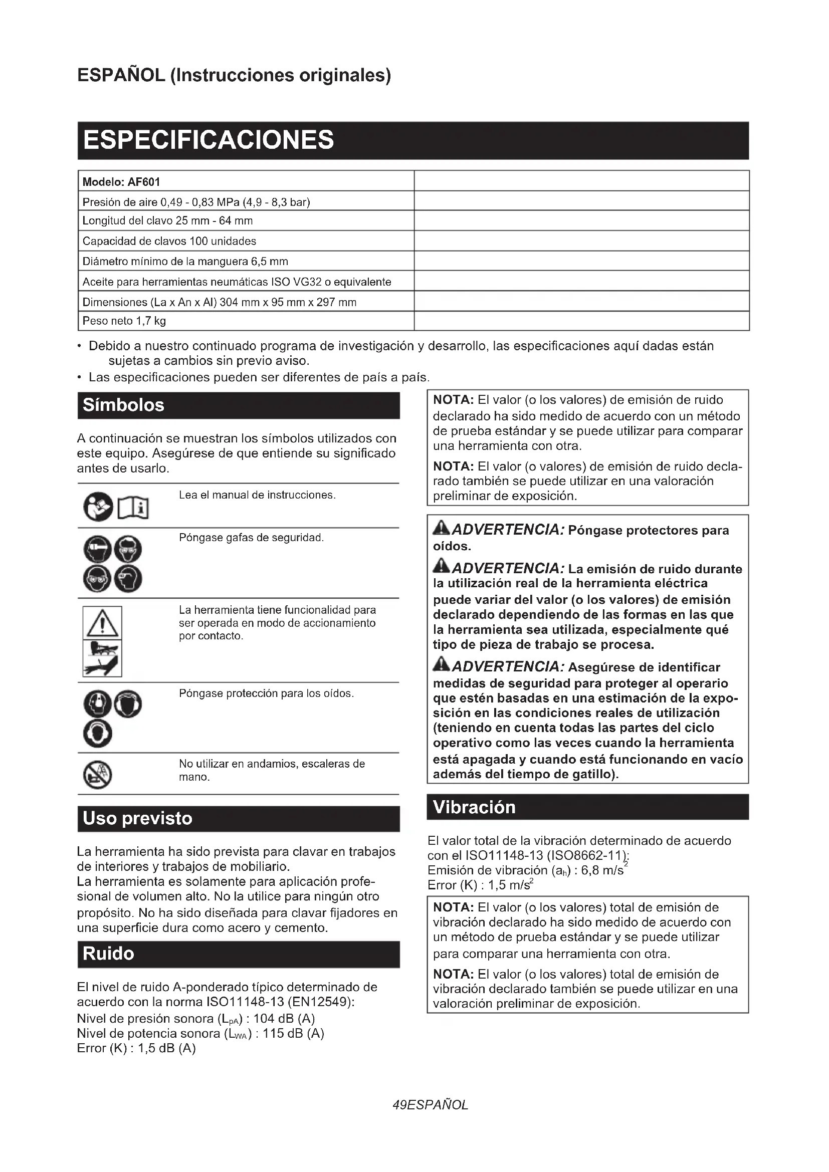 - Las especicaciones pueden ser diferentes de país a país. Símbolos A continuación se muestran los símbolos utilizados con este equipo. Asegúrese de que entiende su signicado antes de usarlo. Lea el manual de instrucciones. Póngase gafas de seguridad. La herramienta tiene funcionalidad para ser operada en modo de accionamiento por contacto. Póngase protección para los oídos. No utilizar en andamios, escaleras de mano. Uso previsto La herramienta ha sido prevista para clavar en trabajos de interiores y trabajos de mobiliario. La herramienta es solamente para aplicación profe- sional de volumen alto. No la utilice para ningún otro propósito. No ha sido diseñada para clavar jadores en una supercie dura como acero y cemento. Ruido El nivel de ruido A-ponderado típico determinado de acuerdo con la norma ISO11148-13 (EN12549): Nivel de presión sonora (L