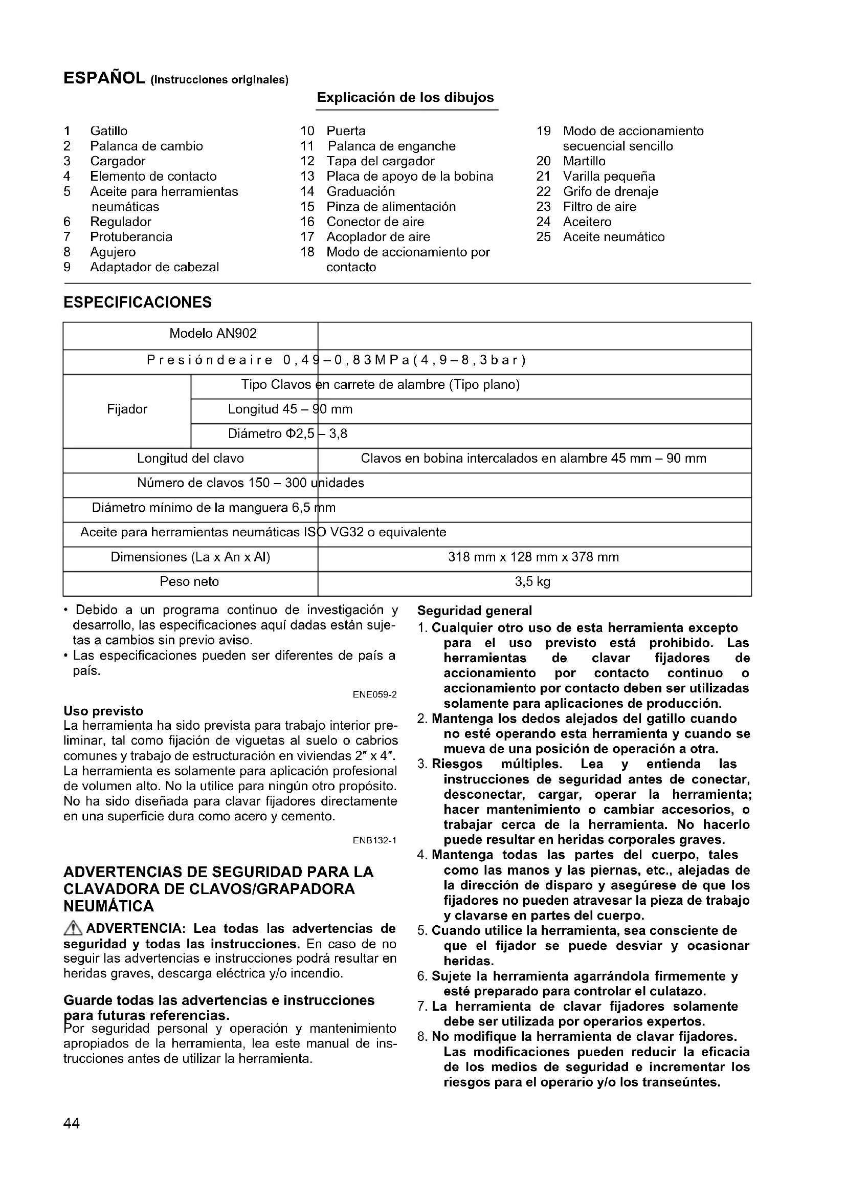 Las modificaciones pueden reducir la eficacia de los medios de seguridad e incrementar los riesgos para el operario y/o los transeúntes. Modelo AN902 Presióndeaire 0,49–0,83MPa(4,9–8,3bar) Fijador Tipo Clavos en carrete de alambre (Tipo plano) Longitud 45 – 90 mm Diámetro Φ2,5 – 3,8 Longitud del clavo Clavos en bobina intercalados en alambre 45 mm – 90 mm Número de clavos 150 – 300 unidades Diámetro mínimo de la manguera 6,5 mm Aceite para herramientas neumáticas ISO VG32 o equivalente Dimensiones (La x An x Al) 318 mm x 128 mm x 378 mm Peso neto 3,5 kg 1 Gatillo 2 Palanca de cambio 3 Cargador 4 Elemento de contacto 5 Aceite para herramientas neumáticas 6 Regulador 7 Protuberancia 8 Agujero 9 Adaptador de cabezal 10 Puerta 11 Palanca de enganche 12 Tapa del cargador 13 Placa de apoyo de la bobina 14 Graduación 15 Pinza de alimentación 16 Conector de aire 17 Acoplador de aire 18 Modo de accionamiento por contacto 19 Modo de accionamiento secuencial sencillo 20 Martillo 21 Varilla pequeña 22 Grifo de drenaje 23 Filtro de aire 24 Aceitero 25 Aceite neumático45