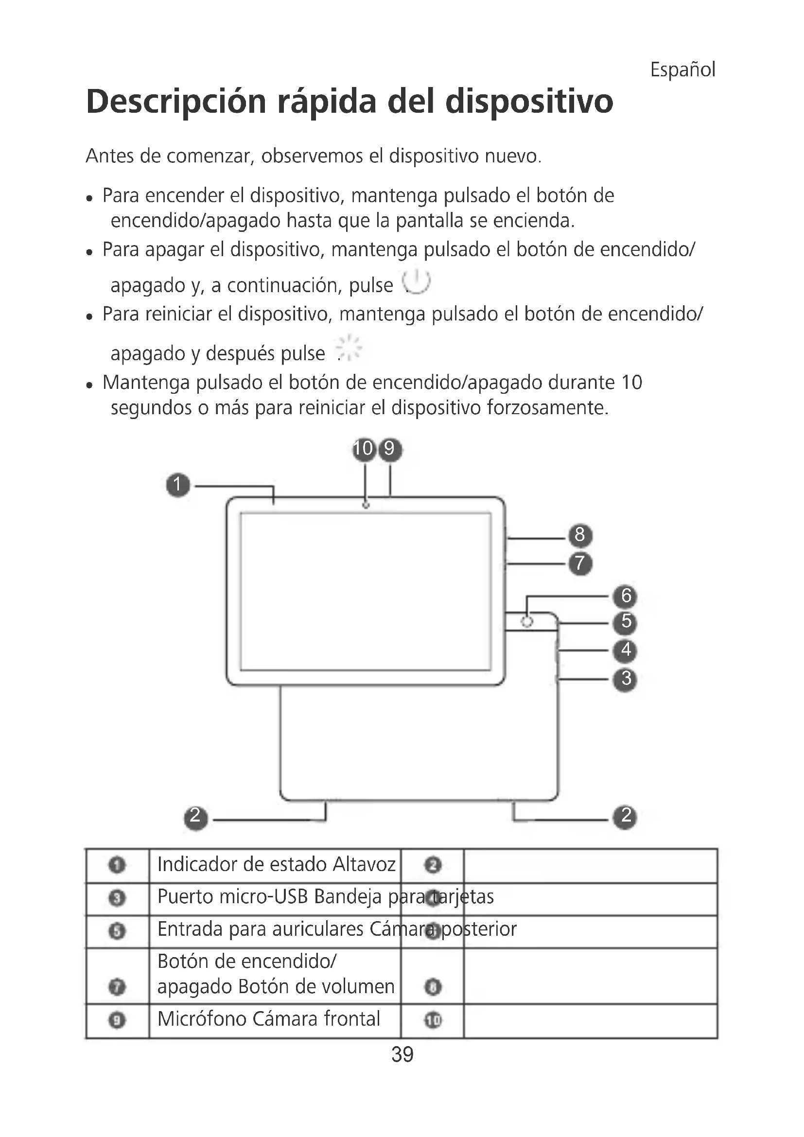 , visitare il sito web www.energystar.gov. Informativa sulla privacy Per comprendere meglio come proteggere le informazioni personali, consultare l'informativa sulla privacy in http://consumer.huawei.com/ privacy-policy. Copyright © Huawei Technologies Co., Ltd. 2018. Tutti i diritti riservati. LA FINALITÀ DEL PRESENTE DOCUMENTO È PURAMENTE INFORMATIVA E NON COSTITUISCE ALCUN TIPO DI GARANZIA. 38Descripción rápida del dispositivo Antes de comenzar, observemos el dispositivo nuevo. l Para encender el dispositivo, mantenga pulsado el botón de encendido/apagado hasta que la pantalla se encienda. l Para apagar el dispositivo, mantenga pulsado el botón de encendido/ apagado y, a continuación, pulse . l Para reiniciar el dispositivo, mantenga pulsado el botón de encendido/ apagado y después pulse . l Mantenga pulsado el botón de encendido/apagado durante 10 segundos o más para reiniciar el dispositivo forzosamente.