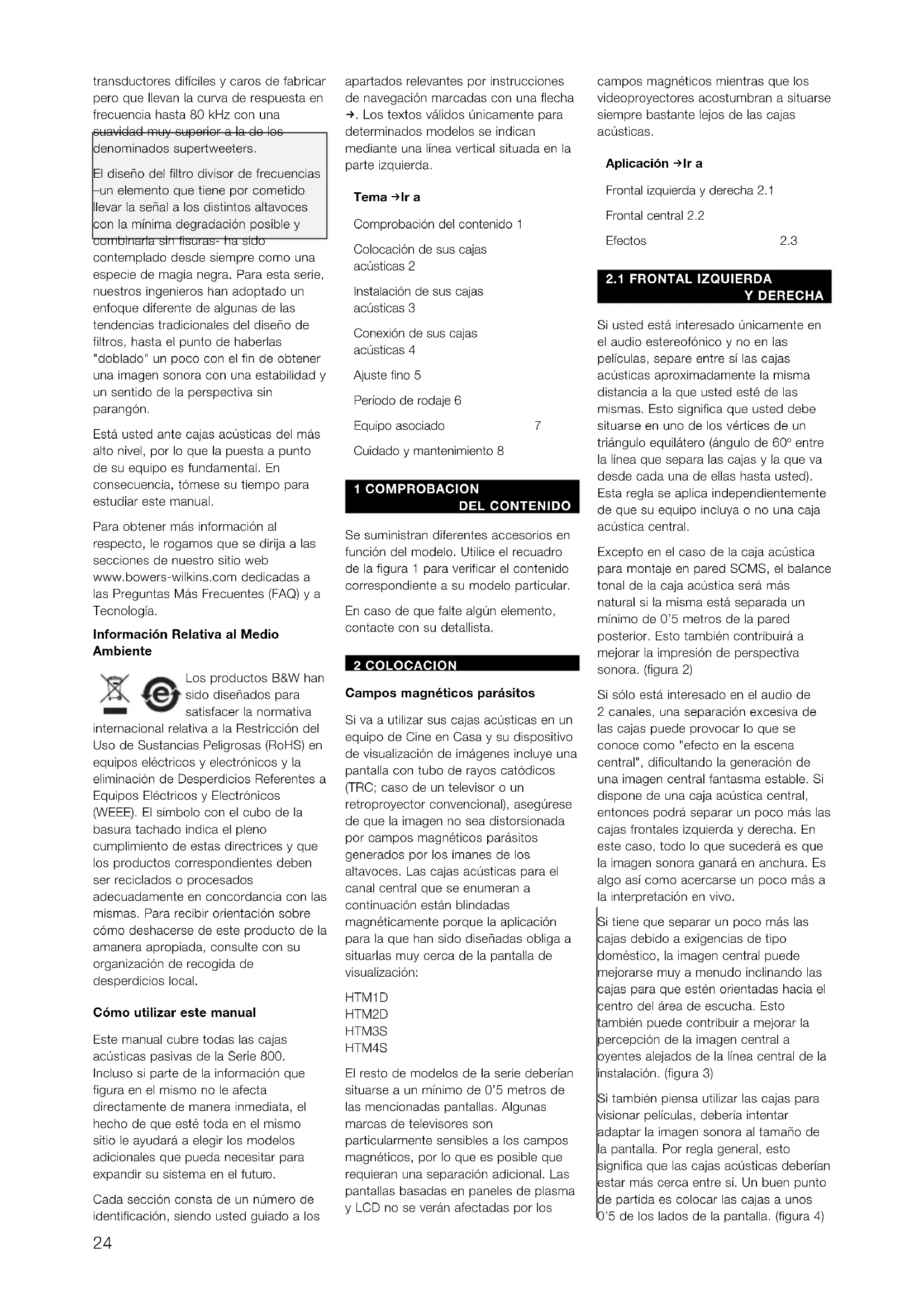 equieran una separación adicional. Las pantallas basadas en paneles de plasma y LCD no se verán afectadas por los campos magnéticos mientras que los videoproyectores acostumbran a situarse siempre bastante lejos de las cajas acústicas. Aplicación f Ir a Frontal izquierda y derecha 2.1 Frontal central 2.2 Efectos 2.3