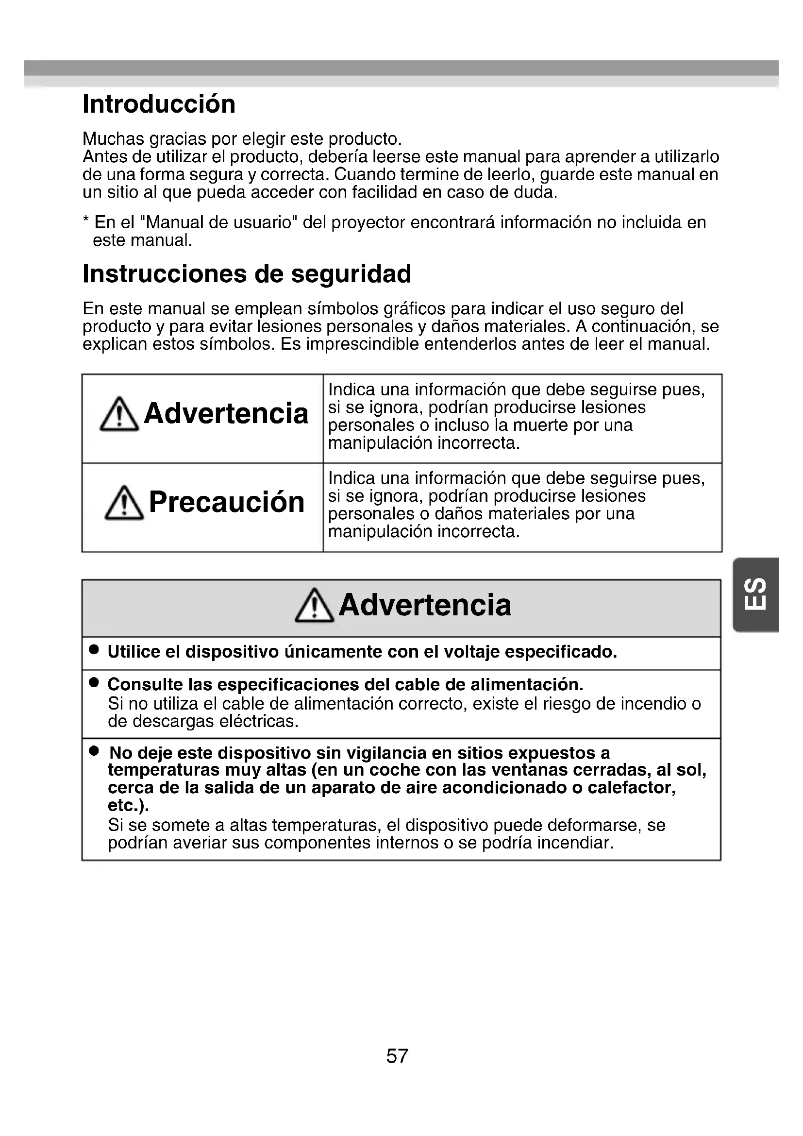 Introducción Muchas gracias por elegir este producto.Antes de utilizar el producto, debería leerse este manual para aprender a utilizarlo de una forma segura y correcta. Cuando termine de leerlo, guarde este manual en un sitio al que pueda acceder con facilidad en caso de duda.* En el "Manual de usuario" del proyector encontrará información no incluida en este manual. Instrucciones de seguridad En este manual se emplean símbolos gráficos para indicar el uso seguro del producto y para evitar lesiones personales y daños materiales. A continuación, se explican estos símbolos. Es imprescindible entenderlos antes de leer el manual. Advertencia Indica una información que debe seguirse pues, si se ignora, podrían producirse lesiones personales o incluso la muerte por una manipulación incorrecta. Precaución Indica una información que debe seguirse pues, si se ignora, podrían producirse lesiones personales o daños materiales por una manipulación incorrecta. Advertencia