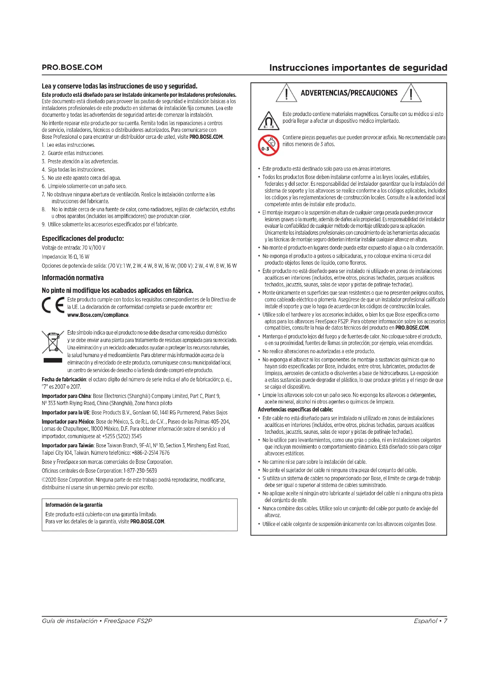 Especificaciones del producto: Voltaje de entrada: 70 V/100 V Impedancia: 16 Ω, 16 W Opciones de potencia de salida: (70 V): 1 W, 2 W, 4 W, 8 W, 16 W; (100 V): 2 W, 4 W, 8 W, 16 W Información normativa No pinte ni modifique los acabados aplicados en fábrica. Este producto cumple con todos los requisitos correspondientes de la Directivade la UE. La declaración de conformidad completa se puede encontraren: www.Bose.com/compliance. Este símbolo indica que el producto no se debe desechar como residuo doméstico ysedebe enviar a una planta para tratamiento de residuos apropiada para su reciclado. Una eliminación y un reciclado adecuados ayudan a proteger los recursos naturales, lasalud humana y el medioambiente. Para obtener más información acerca de la eliminación y el reciclado de este producto, comuníquese con su municipalidad local, uncentro de servicios de desecho o la tienda donde compró este producto. Fecha de fabricación: el octavo dígito del número de serie indica el año de fabricación; p.ej., "7" es 2007 o 2017. Importador para China: Bose Electronics (Shanghái) Company Limited, Part C, Plant 9, Nº 353 North Riying Road, China (Shanghái), Zona franca piloto Importador para la UE: Bose Products B.V., Gorslaan 60, 1441 RG Purmerend, Países Bajos Importador para México: Bose de México, S. de R.L. de C.V. , Paseo de las Palmas 405-204, Lomas de Chapultepec, 11000 México, D.F. Para obtener información sobre el servicio y el importador, comuníquese al: +5255 (5202) 3545 Importador para Taiwán: Bose Taiwan Branch, 9F-A1, Nº 10, Section 3, Minsheng East Road, Taipei City 104, Taiwán. Número telefónico: +886-2-2514 7676 Bose y FreeSpace son marcas comerciales de Bose Corporation. Oficinas centrales de Bose Corporation: 1-877-230-5639 ©2020 Bose Corporation. Ninguna parte de este trabajo podrá reproducirse, modificarse, distribuirse ni usarse sin un permiso previo por escrito. Información de la garantía Este producto está cubierto con una garantía limitada. Para ver los detalles de la garantía, visite PRO.BOSE.COM. ADVERTENCIAS/PRECAUCIONES Este producto contiene materiales magnéticos. Consulte con su médico siesto podría llegar a afectar un dispositivo médico implantado. Contiene piezas pequeñas que pueden provocar asfixia. No recomendable para niños menores de 3 años.