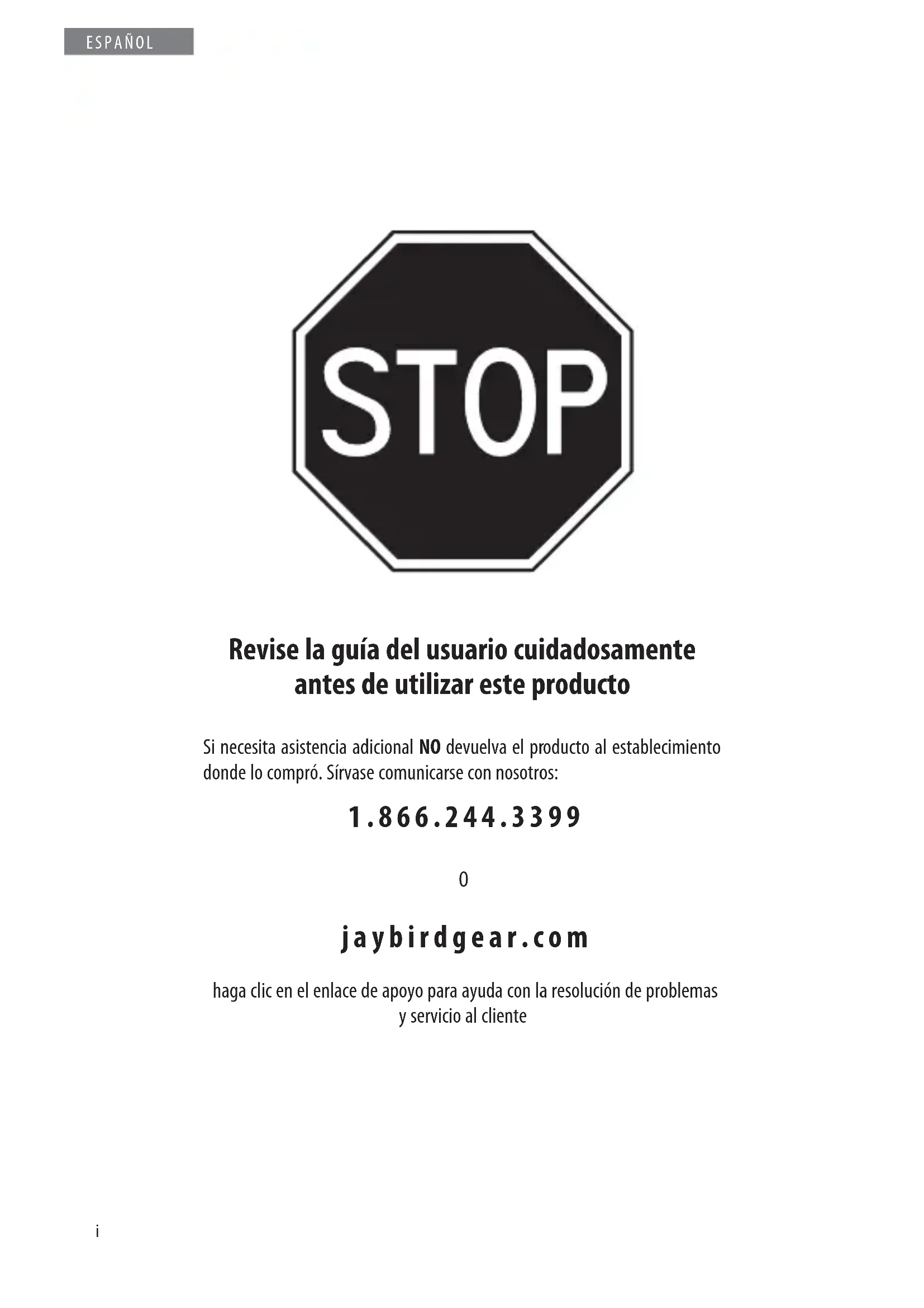 - Consulte al distribuidor o a un técnico experimentado de radio y televisión para solicitar asistencia. Cualesquiera cambios o modi caciones no aprobados expresamente por la parte responsable para el cumplimiento podrían anular la autoridad del usuario conferida para utilizar este equipo. © 2007 JayBird Gear LLC. Todos los derechos reservados. JayBird y el logotipo de JayBird son marcas comerciales de JayBird Gear LLC. iPod es una marca comercial de Apple, Inc., registrada en los EE.UU. y en otros países. Bluetooth es una marca comercial propiedad de Bluetooth SIG, Inc. EE.UU, y con licencia para uso por JayBird Gear LLC. “Fabricado para iPod” signi ca que un accesorio electrónico ha sido diseñado para conectarse especí camente a un iPod y ha recibido la certi cación del desarrollador de que satisface los estándares de desempeño de Apple. Apple no es responsable por el funcionamiento de este dispositivo ni por el acatamiento de estos estándares. P: La música del teléfono sólo se escucha a través de un auricular o algunas veces no funciona R: Cada teléfono tiene diferentes con guraciones de software lo que resulta en diversos grados de compatibilidad con los auriculares estereofónicos Bluetooth®. Visite jaybirdgear.com/phones para obtener información adicional. P: Mis auriculares no se cargan completamente R: Quizás los auriculares no estén bien conectados a los puntos de carga del cargador. Asegúrese que el auricular izquierdo esté bien conectado y que la luz roja del auricular derecho esté iluminada. Si la conexión no es óptima o se desconecta con facilidad incluso con un leve movimiento, comuníquese con JayBird para obtener un cargador de reemplazo durante el primer año de uso. Servicio al Cliente Teléfono: +1.866.244.3399 (EE.UU.) En línea: jaybirdgear.com Aprobaciones de Agencias y Certi cacionesESPAÑOL 12Model: JB-200