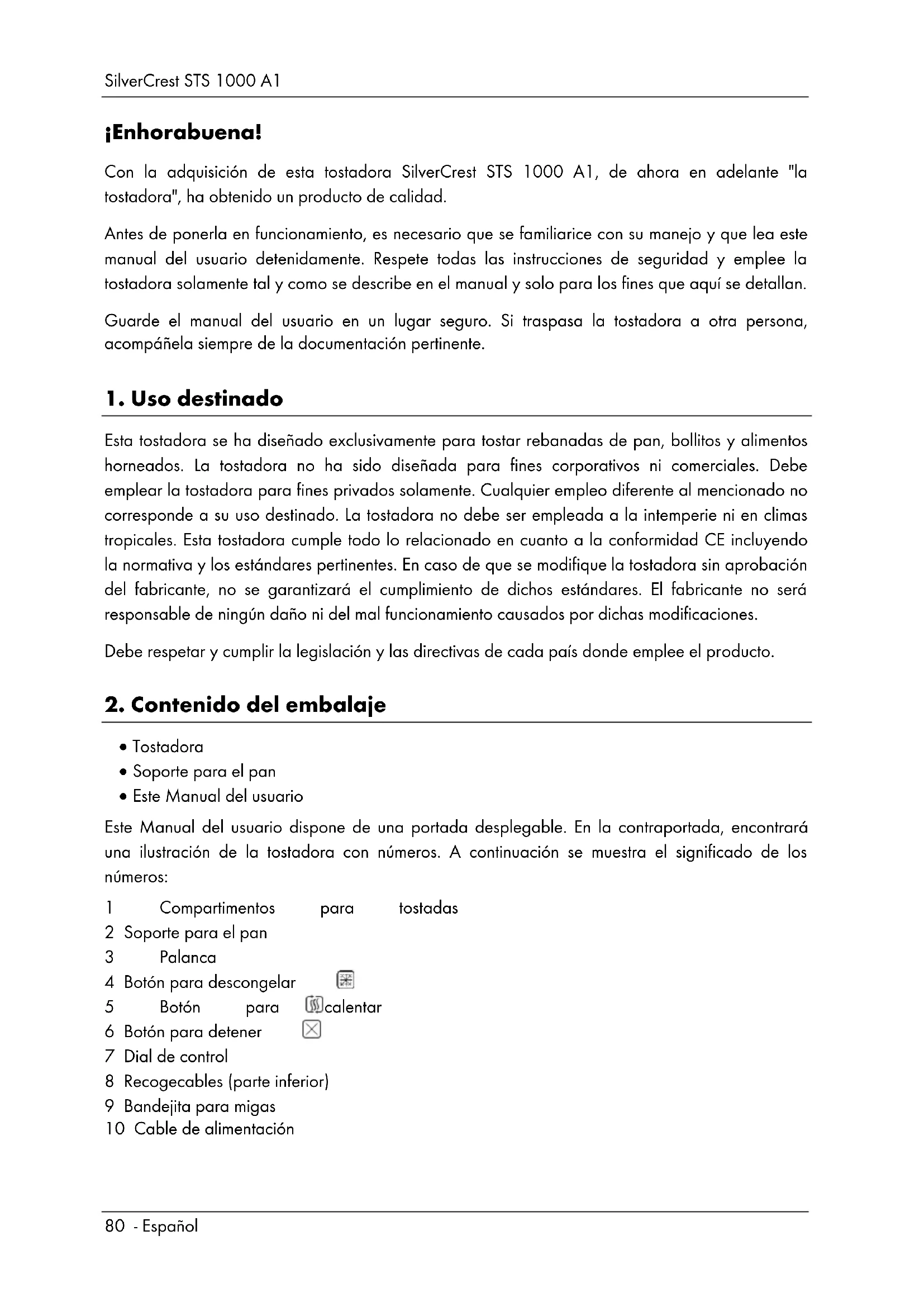 ¡Enhorabuena! Con la adquisición de esta tostadora SilverCrest STS 1000 A1, de ahora en adelante "la tostadora", ha obtenido un producto de calidad. Antes de ponerla en funcionamiento, es necesario que se familiarice con su manejo y que lea este manual del usuario detenidamente. Respete todas las instrucciones de seguridad y emplee la tostadora solamente tal y como se describe en el manual y solo para los fines que aquí se detallan. Guarde el manual del usuario en un lugar seguro. Si traspasa la tostadora a otra persona, acompáñela siempre de la documentación pertinente.