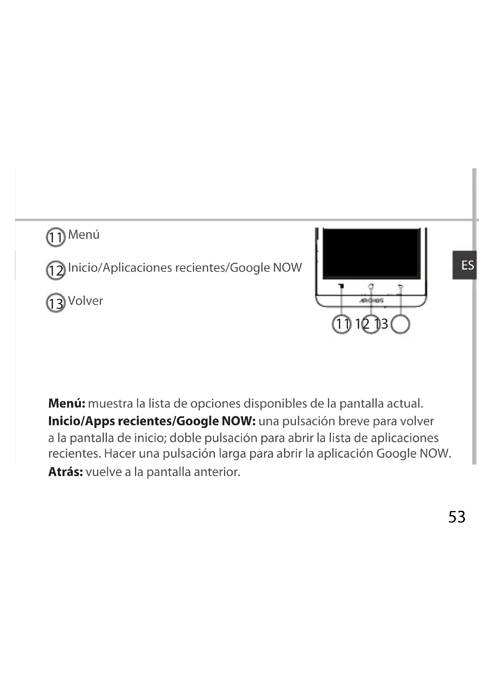 Menú: muestra la lista de opciones disponibles de la pantalla actual. Inicio/Apps recientes/Google NOW: una pulsación breve para volver a la pantalla de inicio; doble pulsación para abrir la lista de aplicaciones recientes. Hacer una pulsación larga para abrir la aplicación Google NOW. Atrás: vuelve a la pantalla anterior.54 Ensamblado Abrir