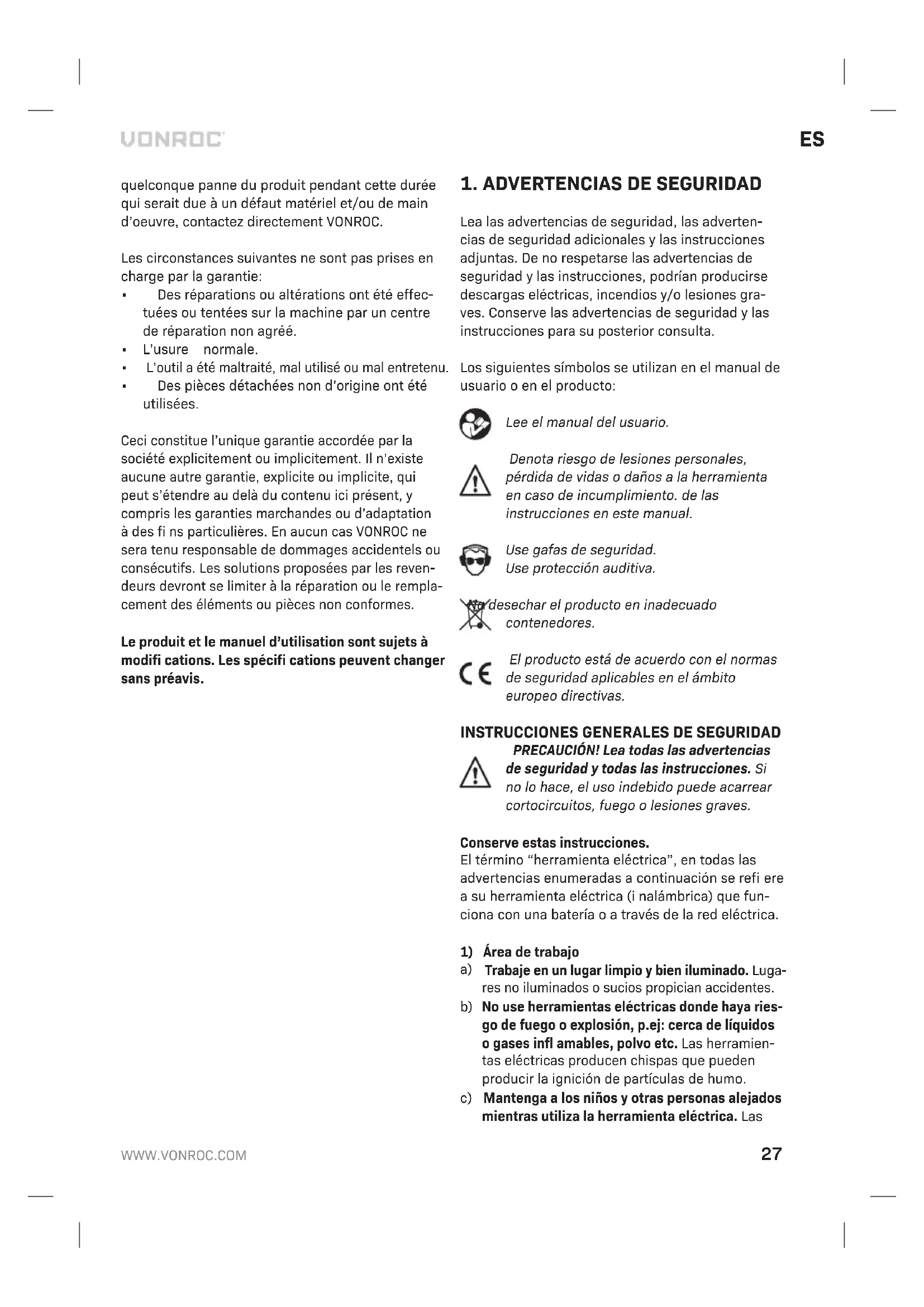 Los productos VONROC han sido desarrollados con los más altos estándares de calidad y VONROC garantiza que están exentos de defectos relacio- nados con los materiales y la fabricación durante el periodo legalmente estipulado, a contar desde la fecha de compra original. En caso de que el producto presente defectos relacionados con los materiales y/o la fabricación durante este periodo, póngase directamente en contacto VONROC. La presente garantía se excluye en los siguientes casos:
