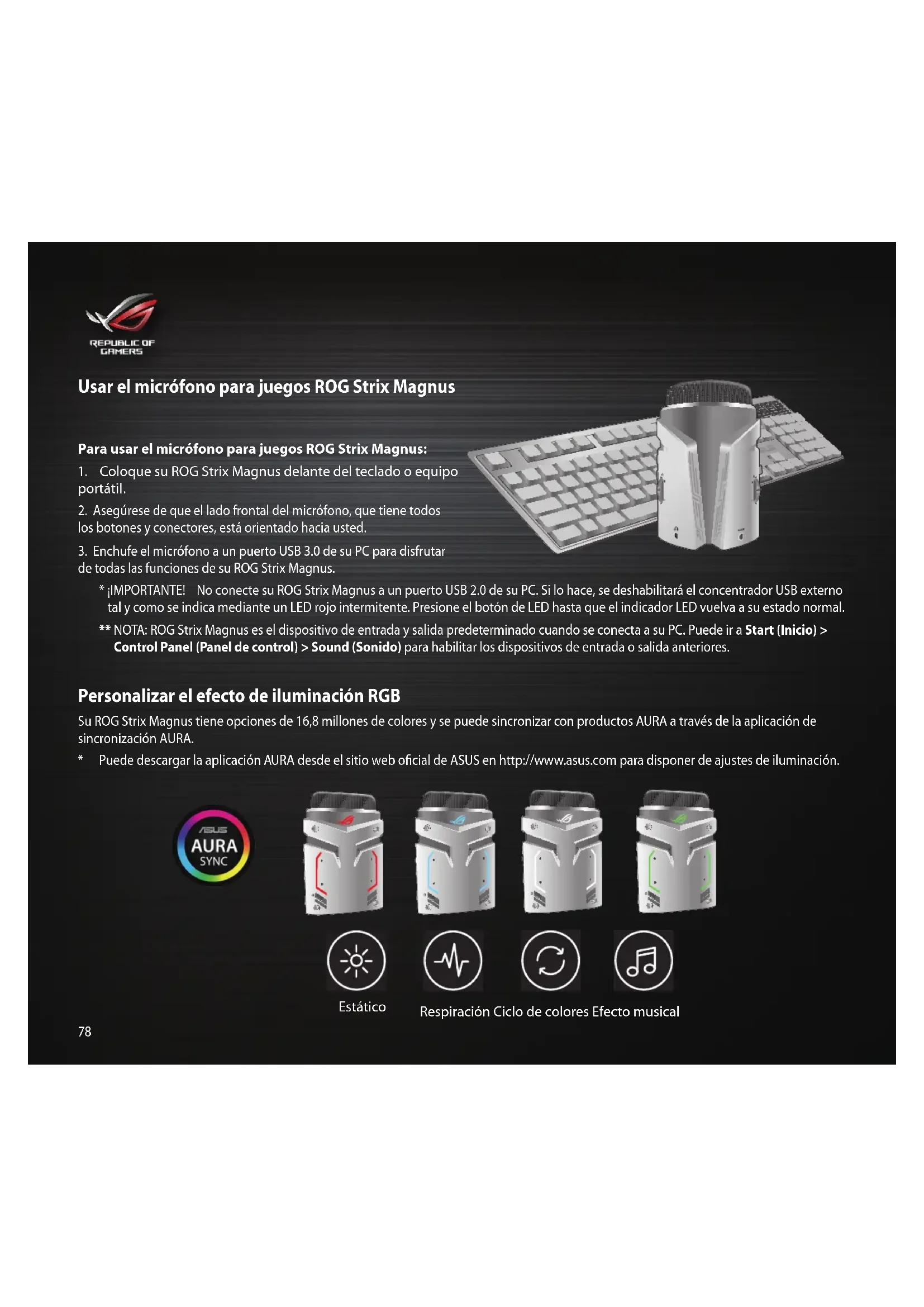 - ¡IMPORTANTE! No conecte su ROG Strix Magnus a un puerto USB 2.0 de su PC. Si lo hace, se deshabilitará el concentrador USB externo tal y como se indica mediante un LED rojo intermitente. Presione el botón de LED hasta que el indicador LED vuelva a su estado normal. ** NOTA: ROG Strix Magnus es el dispositivo de entrada y salida predeterminado cuando se conecta a su PC. Puede ir a Start (Inicio) > Control Panel (Panel de control) > Sound (Sonido) para habilitar los dispositivos de entrada o salida anteriores. Personalizar el efecto de iluminación RGB Su ROG Strix Magnus tiene opciones de 16,8 millones de colores y se puede sincronizar con productos AURA a través de la aplicación de sincronización AURA.