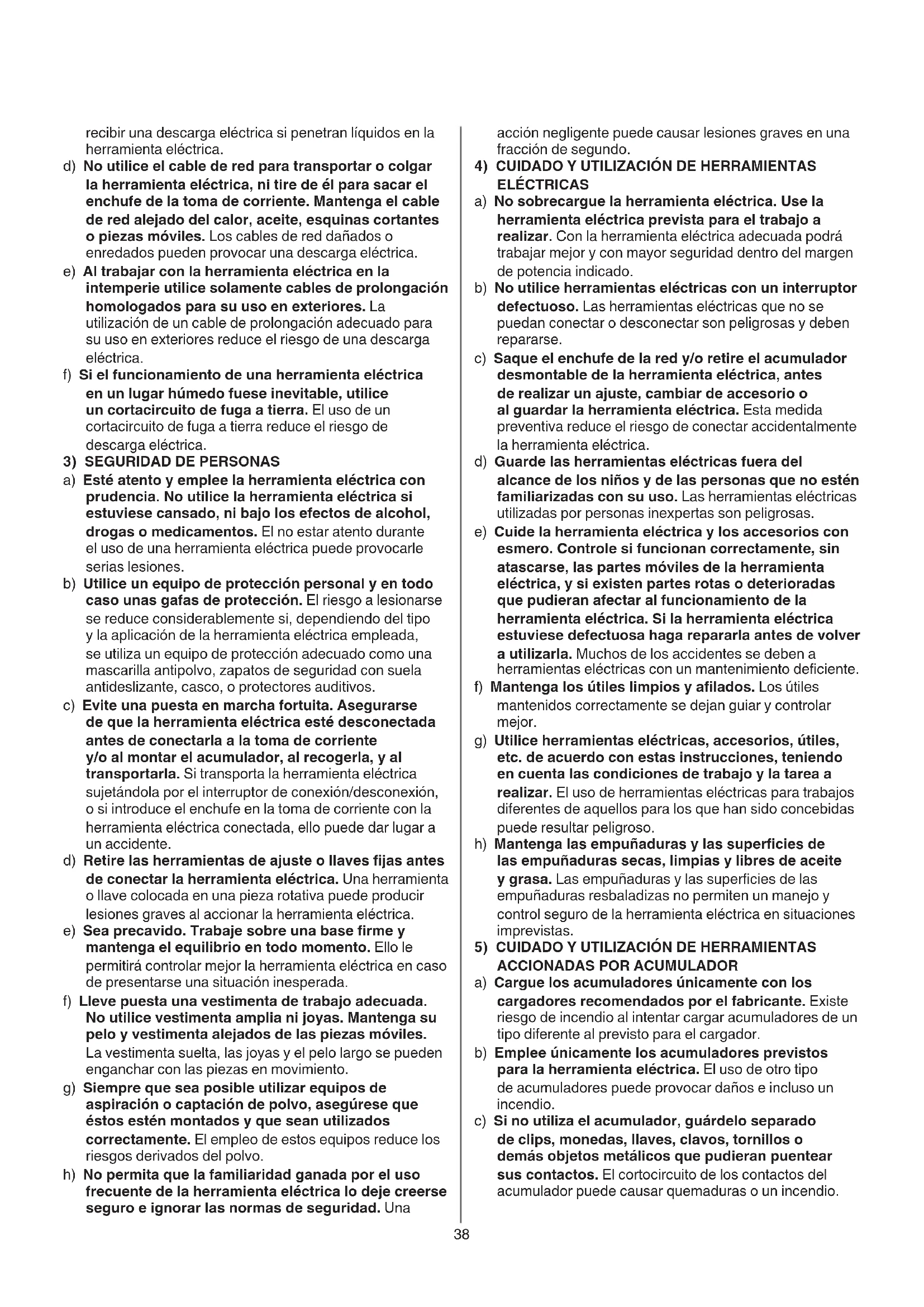 a) Cargue los acumuladores únicamente con los cargadores recomendados por el fabricante. Existe riesgo de incendio al intentar cargar acumuladores de un tipo diferente al previsto para el cargador. b) Emplee únicamente los acumuladores previstos para la herramienta eléctrica. El uso de otro tipo de acumuladores puede provocar daños e incluso un incendio. c) Si no utiliza el acumulador, guárdelo separado de clips, monedas, llaves, clavos, tornillos o demás objetos metálicos que pudieran puentear sus contactos. El cortocircuito de los contactos del acumulador puede causar quemaduras o un incendio. recibir una descarga eléctrica si penetran líquidos en la herramienta eléctrica. d) No utilice el cable de red para transportar o colgar la herramienta eléctrica, ni tire de él para sacar el enchufe de la toma de corriente. Mantenga el cable de red alejado del calor, aceite, esquinas cortantes o piezas móviles. Los cables de red dañados o enredados pueden provocar una descarga eléctrica. e) Al trabajar con la herramienta eléctrica en la intemperie utilice solamente cables de prolongación homologados para su uso en exteriores. La utilización de un cable de prolongación adecuado para su uso en exteriores reduce el riesgo de una descarga eléctrica. f) Si el funcionamiento de una herramienta eléctrica en un lugar húmedo fuese inevitable, utilice un cortacircuito de fuga a tierra. El uso de un cortacircuito de fuga a tierra reduce el riesgo de descarga eléctrica.
