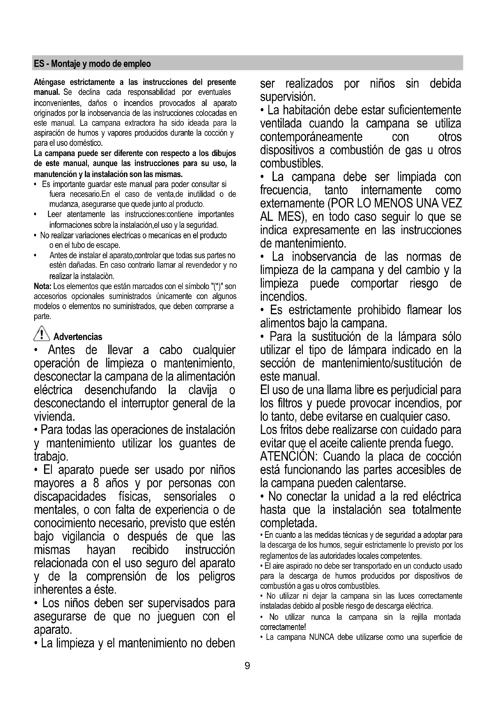 - La inobservancia de las normas de limpieza de la campana y del cambio y la limpieza puede comportar riesgo de incendios.