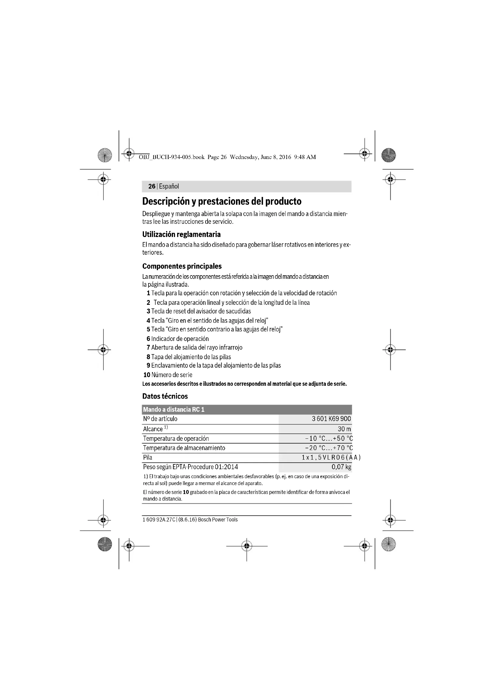recta al sol) puede llegar a mermar el alcance del aparato. El número de serie 10 grabado en la placa de características permite identificar de forma unívoca el mando a distancia. OBJ_BUCH-934-005.book Page 26 Wednesday, June 8, 2016 9:48 AMEspañol | 27 Bosch Power Tools 1 609 92A 27C | (8.6.16) Montaje Inserción y cambio de la pila Se recomienda utilizar pilas alcalinas de manganeso en el mando a distancia. Para abrir la tapa del alojamiento de la pila 8 presione el enclavamiento 9 en sentido de la flecha y retire la tapa. Inserte la pila que se adjunta. Respete la polaridad indica- da en el alojamiento de las pilas. Saque la pila del mando a distancia si pretende no utilizarlo durante largo tiempo. Con el transcurso del tiempo la pila puede llegarse a corroer o autodescar- gar. Operación Puesta en marcha Proteja el mando a distancia de la humedad y de la exposición directa al sol. No exponga el mando a distancia ni a temperaturas extremas ni a cambios bruscos de temperatura. No lo deje, p.ej., en el coche durante un largo tiempo. Si el mando a distancia ha sufrido un cambio fuerte de temperatura, antes de po- nerlo en servicio, esperar primero a que se atempere. El mando a distancia queda en disposición de funcionamiento siempre que sea sufi- ciente la tensión de la pila aplicada. Coloque el láser rotativo de manera que las señales que emite el mando a distancia in- cidan directamente sobre una de las lentes de recepción del láser rotativo (ver ins- trucciones de manejo del láser rotativo). El alcance del mando a distancia se reduce si éste no puede orientarse directamente contra una de las lentes de recepción. El al- cance en señales indirectas puede que vuelva a mejorar si la señal es reflejada (p.ej. por paredes). Tras pulsar una de las teclas del mando a distancia se enciende el indicador de opera- ción 6 para indicar que se ha emitido una señal. El láser rotativo no puede conectarse/desconectarse con el mando a distancia. Modos de operación Informaciones detalladas sobre las funciones del láser rotativo las encontrará en las instrucciones de servicio del mismo. OBJ_BUCH-934-005.book Page 27 Wednesday, June 8, 2016 9:48 AM28 | Español 1 609 92A 27C | (8.6.16) Bosch Power Tools Operación con rotación (150/300/600 min
