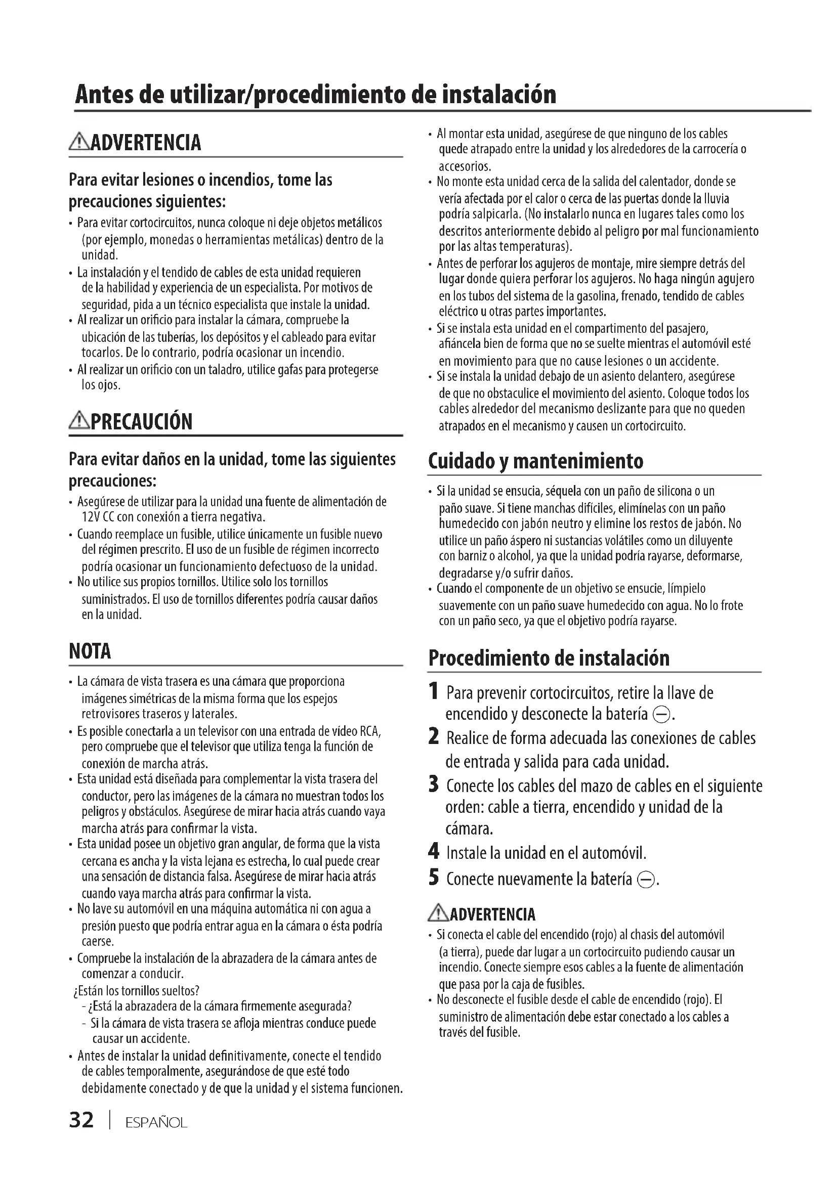 - Si la unidad se ensucia, séquela con un paño de silicona o un paño suave. Si tiene manchas difíciles, elimínelas con un paño humedecido con jabón neutro y elimine los restos de jabón. No utilice un paño áspero ni sustancias volátiles como un diluyente con barniz o alcohol, ya que la unidad podría rayarse, deformarse, degradarse y/o sufrir daños.• Cuando el componente de un objetivo se ensucie, límpielo suavemente con un paño suave humedecido con agua. No lo frote con un paño seco, ya que el objetivo podría rayarse. Procedimiento de instalación 1 Para prevenir cortocircuitos, retire la llave de encendido y desconecte la batería -. 2 Realice de forma adecuada las conexiones de cables de entrada y salida para cada unidad. 3 Conecte los cables del mazo de cables en el siguiente orden: cable a tierra, encendido y unidad de la cámara. 4 Instale la unidad en el automóvil. 5 Conecte nuevamente la batería -. ADVERTENCIA• Si conecta el cable del encendido (rojo) al chasis del automóvil (a tierra), puede dar lugar a un cortocircuito pudiendo causar un incendio. Conecte siempre esos cables a la fuente de alimentación que pasa por la caja de fusibles.• No desconecte el fusible desde el cable de encendido (rojo). El suministro de alimentación debe estar conectado a los cables a través del fusible. ADVERTENCIA Para evitar lesiones o incendios, tome las precauciones siguientes: