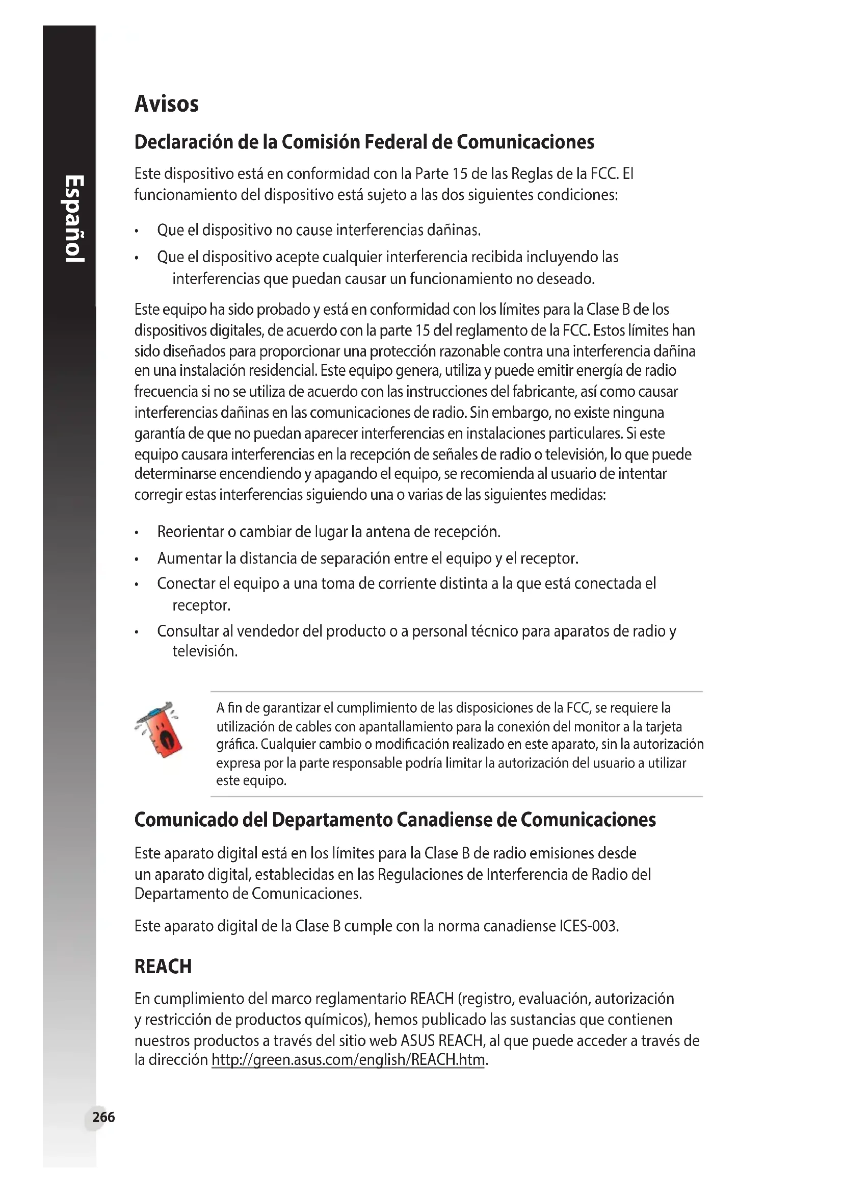 - Consultaralvendedordelproductooapersonaltécnicoparaaparatosderadioy televisión. Comunicado del Departamento Canadiense de Comunicaciones Este aparato digital está en los límites para la Clase B de radio emisiones desde un aparato digital, establecidas en las Regulaciones de Interferencia de Radio del Departamento de Comunicaciones. Este aparato digital de la Clase B cumple con la norma canadiense ICES-003. A n de garantizar el cumplimiento de las disposiciones de la FCC, se requiere la utilización de cables con apantallamiento para la conexión del monitor a la tarjeta gráca. Cualquier cambio o modicación realizado en este aparato, sin la autorización expresa por la parte responsable podría limitar la autorización del usuario a utilizar este equipo. REACH En cumplimiento del marco reglamentario REACH (registro, evaluación, autorización y restricción de productos químicos), hemos publicado las sustancias que contienen nuestros productos a través del sitio web ASUS REACH, al que puede acceder a través de la dirección http://green.asus.com/english/REACH.htm.267 Español Información de seguridad Seguridad del sistema eléctrico