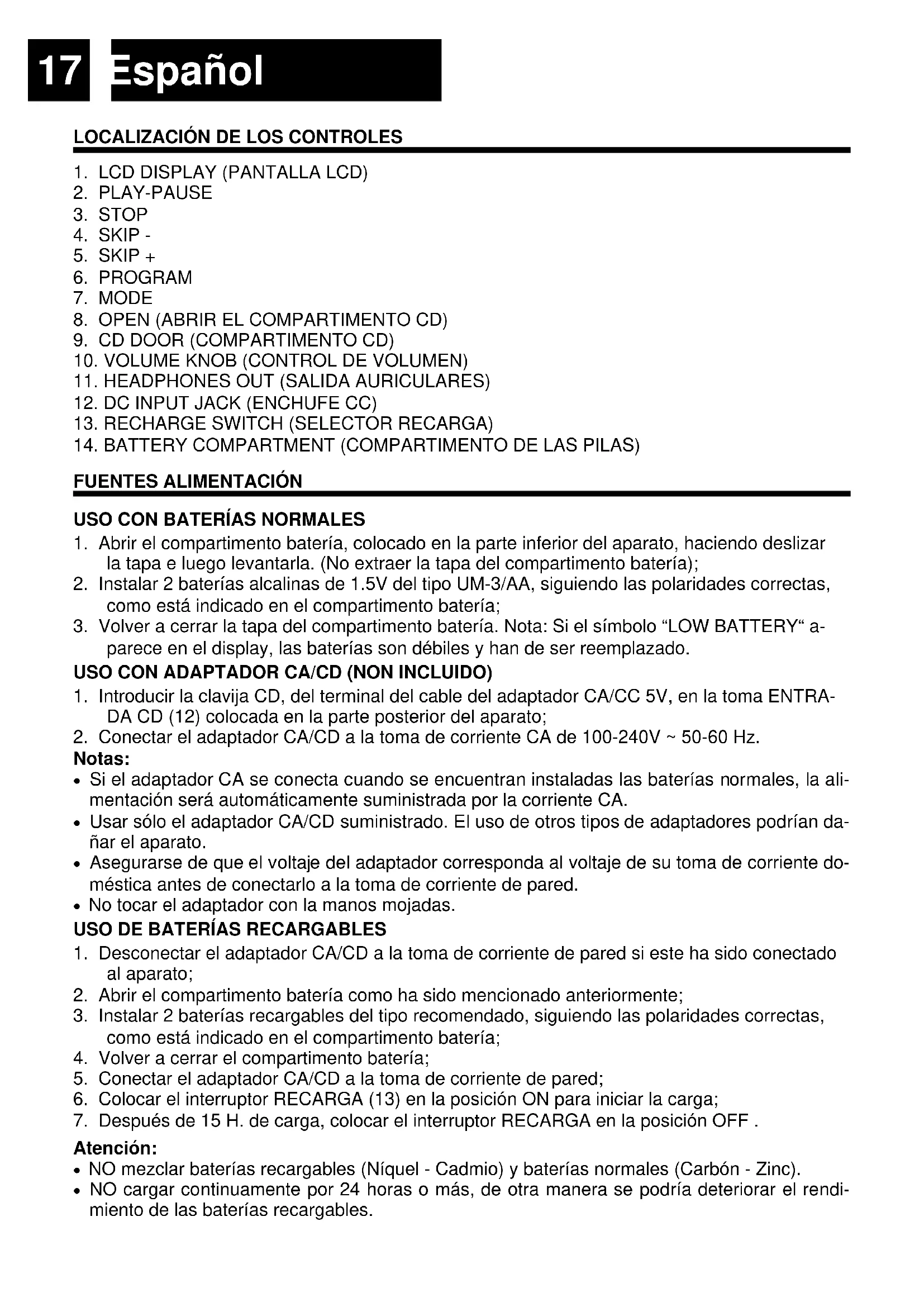 Fuente de alimentacion: CA 5V (Adapter). CC 3V = (2 x “LR6” Baterias). General Salida Auriculares: 3.5mm jack. Las características tecnicas estan sujetas a cambios sin aviso previo. La presencia de esta marca en el producto o en el materiál informativo que lo acompaña, indica que al finali-zar su vida útil no deberá eliminarse junto con otros residuos domésticos. Para evitar los posi bl es daños al medi o ambi ente o a l a sal ud humane que representa la eliminación incontrolada de residuos, separe este producto de otros tipos de residuos y reciclelo correctamente para promover la reutilización sostenible de re-cursos materiales. Los usuarios particulares pueden contactar con el establecimiento donde adqui ri eron el producto, o con l as autori dades l ocal es pertinentes, para informarse sobre cómo y dónde pueden lIevario para que sea sometido a un reciclaje ecológico y seguro. Los usuarios comerciales pueden contactar con su proveedor y consultar las condiciones del contrato de compra. Este produco no debe eliminarse mezclado con otros residuos comerciales.