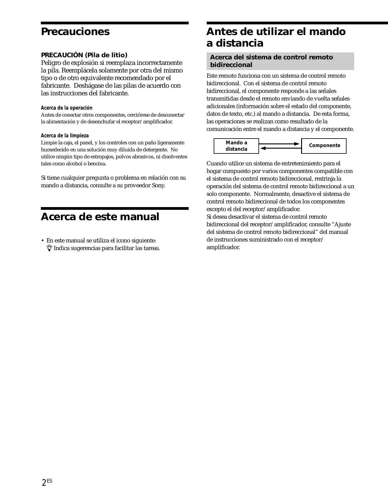 PRECAUCIÓN (Pila de litio) Peligro de explosión si reemplaza incorrectamente la pila. Reemplácela solamente por otra del mismo tipo o de otro equivalente recomendado por el fabricante. Deshágase de las pilas de acuerdo con las instrucciones del fabricante. Acerca de la operación Antes de conectar otros componentes, cerciórese de desconectar la alimentación y de desenchufar el receptor/amplificador.