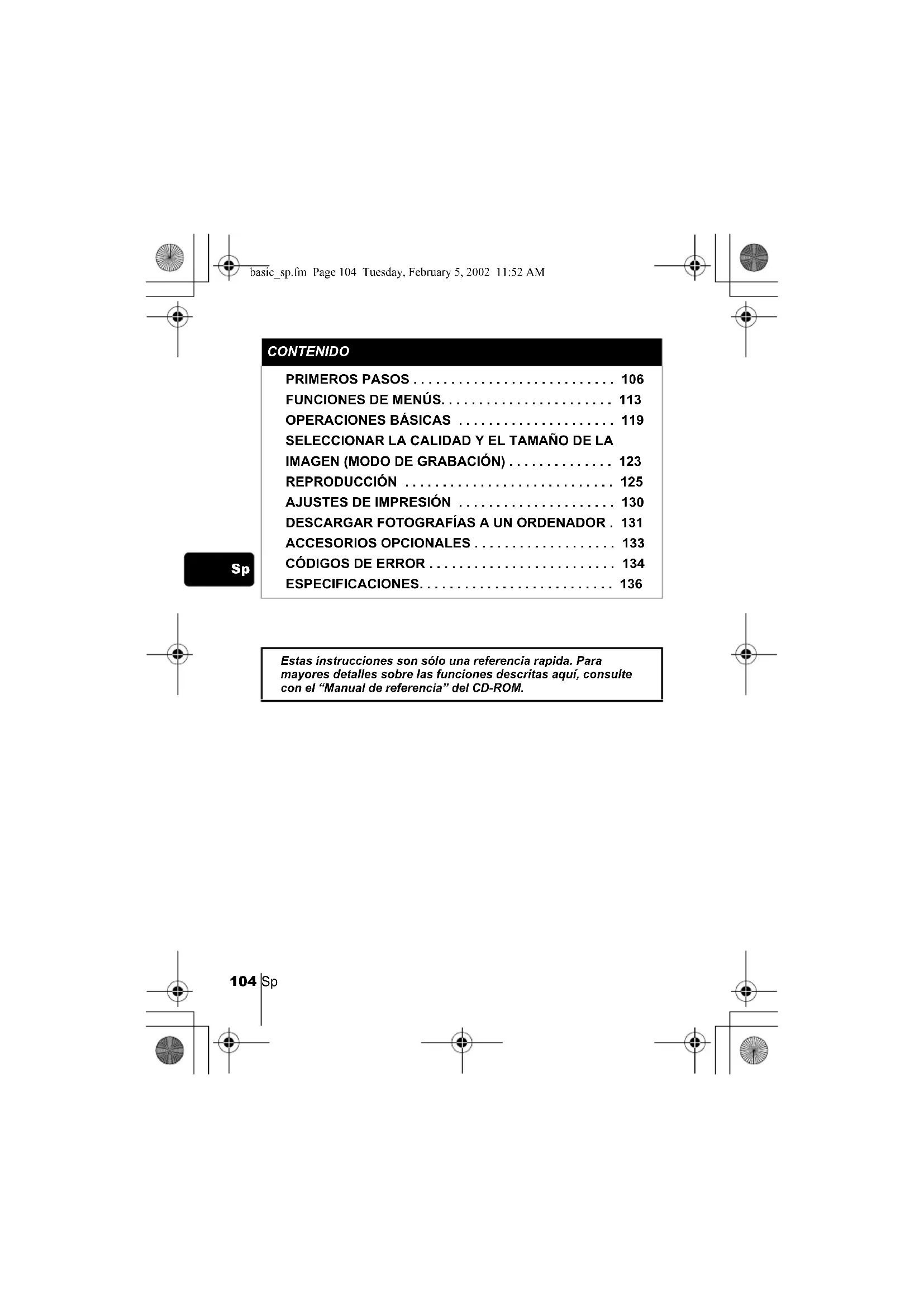 ESPECIFICACIONES. . . . . . . . . . . . . . . . . . . . . . . . . . 136 Estas instrucciones son sólo una referencia rapida. Para mayores detalles sobre las funciones descritas aquí, consulte con el “Manual de referencia” del CD-ROM. basic_sp.fm Page 104 Tuesday, February 5, 2002 11:52 AMSp 105