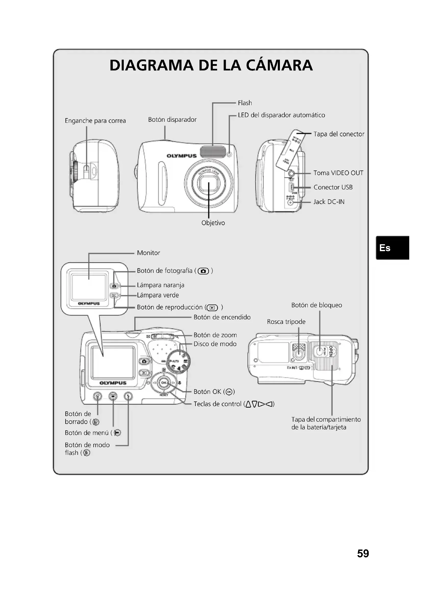 Teclas de control ([\]^) Botón OK (i) Enganche para correa Tapa del compartimiento de la batería/tarjeta Rosca trípode Toma VIDEO OUT Conector USB Jack DC-IN Botón de borrado ( ) Botón de menú ( ) Monitor Lámpara verde Lámpara naranja Botón de encendido Disco de modo Botón de modo flash ( ) Botón de bloqueo OPEN PUSH Tapa del conector Objetivo d4304_es_basic_US.book Page 59 Thursday, July 28, 2005 5:11 PM60