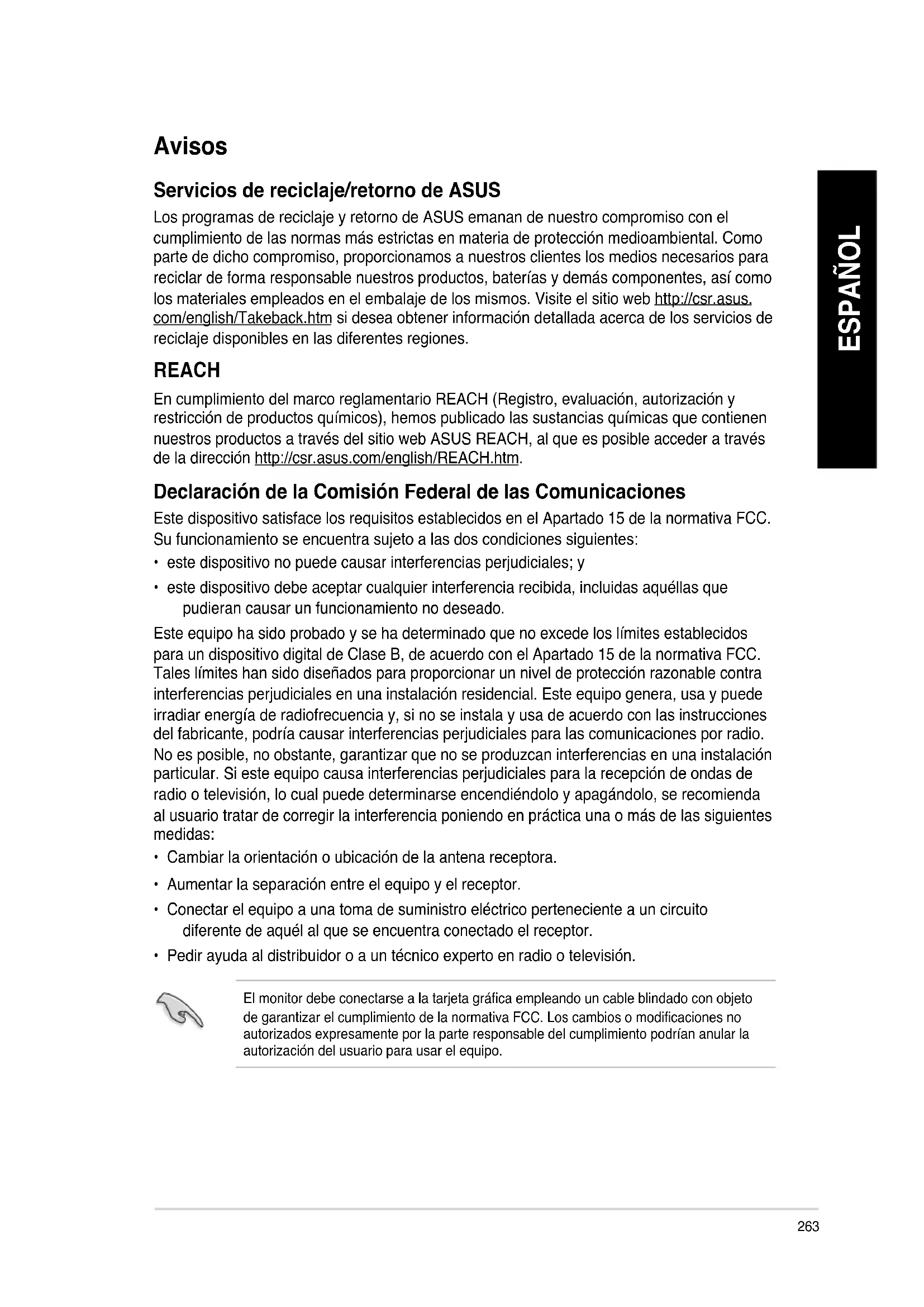 - Capítulo 7 Resolución de problemas Resolución de problemas 63 ESPAÑOL ESPAÑOL ESPAÑOL ESPAÑOL Avisos Servicios de reciclaje/retorno de ASUS Los programas de reciclaje y retorno de ASUS emanan de nuestro compromiso con el cumplimiento de las normas más estrictas en materia de protección medioambiental. Como parte de dicho compromiso, proporcionamos a nuestros clientes los medios necesarios para reciclar de forma responsable nuestros productos, baterías y demás componentes, así como los materiales empleados en el embalaje de los mismos. Visite el sitio web http://csr.asus. com/english/Takeback.htm si desea obtener información detallada acerca de los servicios de reciclaje disponibles en las diferentes regiones. REACH En cumplimiento del marco reglamentario REACH (Registro, evaluación, autorización y restricción de productos químicos), hemos publicado las sustancias químicas que contienen nuestros productos a través del sitio web ASUS REACH, al que es posible acceder a través de la dirección http://csr.asus.com/english/REACH.htm. Declaración de la Comisión Federal de las Comunicaciones Este dispositivo satisface los requisitos establecidos en el Apartado 15 de la normativa FCC. Su funcionamiento se encuentra sujeto a las dos condiciones siguientes: p. 3152
