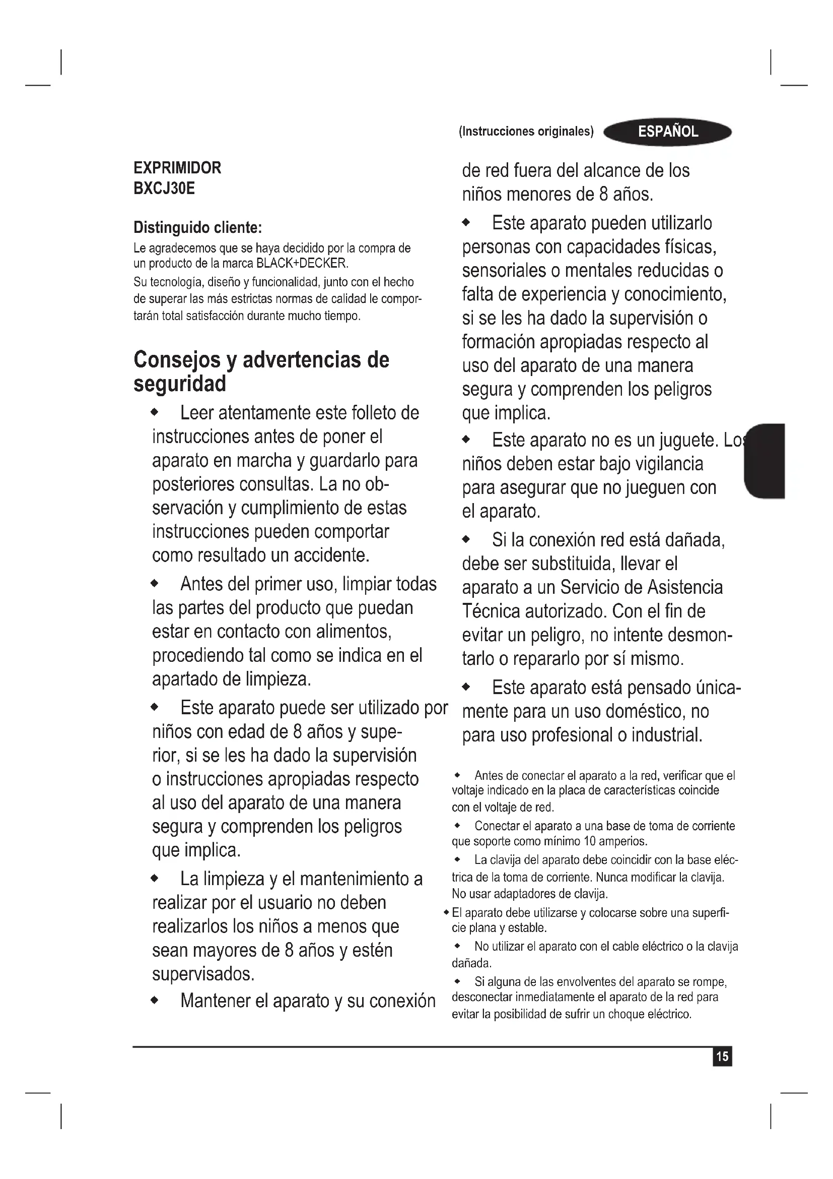 EXPRIMIDOR BXCJ30E Distinguido cliente: Le agradecemos que se haya decidido por la compra de un producto de la marca BLACK+DECKER. Su tecnología, diseño y funcionalidad, junto con el hecho de superar las más estrictas normas de calidad le compor- tarán total satisfacción durante mucho tiempo. Consejos y advertencias de seguridad Leer atentamente este folleto de instrucciones antes de poner el aparato en marcha y guardarlo para posteriores consultas. La no ob- servación y cumplimiento de estas instrucciones pueden comportar como resultado un accidente. Antes del primer uso, limpiar todas las partes del producto que puedan estar en contacto con alimentos, procediendo tal como se indica en el apartado de limpieza. Este aparato puede ser utilizado por niños con edad de 8 años y supe- rior, si se les ha dado la supervisión o instrucciones apropiadas respecto al uso del aparato de una manera segura y comprenden los peligros que implica. La limpieza y el mantenimiento a realizar por el usuario no deben realizarlos los niños a menos que sean mayores de 8 años y estén supervisados. Mantener el aparato y su conexión de red fuera del alcance de los niños menores de 8 años. Este aparato pueden utilizarlo personas con capacidades físicas, sensoriales o mentales reducidas o falta de experiencia y conocimiento, si se les ha dado la supervisión o formación apropiadas respecto al uso del aparato de una manera segura y comprenden los peligros que implica. Este aparato no es un juguete. Los niños deben estar bajo vigilancia para asegurar que no jueguen con el aparato. Si la conexión red está dañada, debe ser substituida, llevar el aparato a un Servicio de Asistencia Técnica autorizado. Con el n de evitar un peligro, no intente desmon- tarlo o repararlo por sí mismo. Este aparato está pensado única- mente para un uso doméstico, no para uso profesional o industrial. Antes de conectar el aparato a la red, vericar que el voltaje indicado en la placa de características coincide con el voltaje de red. Conectar el aparato a una base de toma de corriente que soporte como mínimo 10 amperios. La clavija del aparato debe coincidir con la base eléc- trica de la toma de corriente. Nunca modicar la clavija. No usar adaptadores de clavija. El aparato debe utilizarse y colocarse sobre una super- cie plana y estable. No utilizar el aparato con el cable eléctrico o la clavija dañada. Si alguna de las envolventes del aparato se rompe, desconectar inmediatamente el aparato de la red para evitar la posibilidad de sufrir un choque eléctrico.ESPAÑOL (Instrucciones originales)