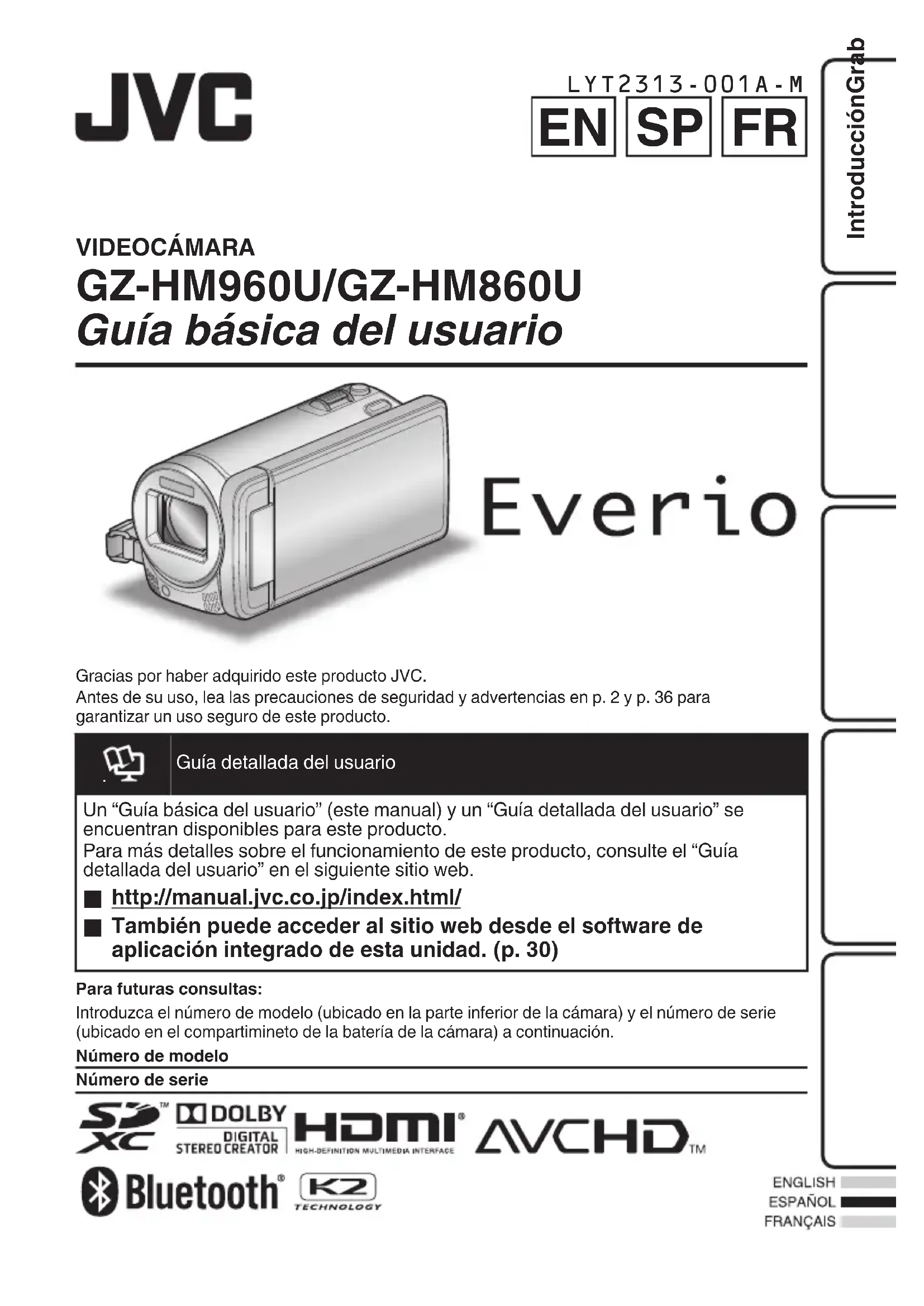 GZ-HM960U/GZ-HM860U Guía básica del usuario Gracias por haber adquirido este producto JVC.Antes de su uso, lea las precauciones de seguridad y advertencias en p. 2 y p. 36 paragarantizar un uso seguro de este producto. Guía detallada del usuarioUn “Guía básica del usuario” (este manual) y un “Guía detallada del usuario” seencuentran disponibles para este producto.Para más detalles sobre el funcionamiento de este producto, consulte el “Guíadetallada del usuario” en el siguiente sitio web.