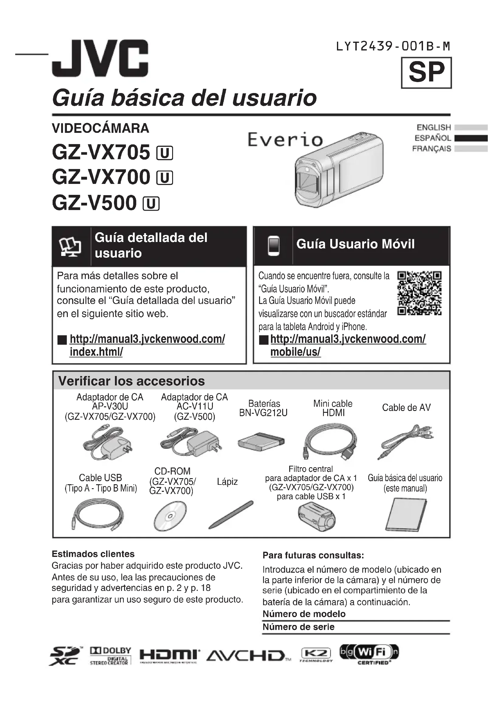Guía detallada del usuario Para más detalles sobre elfuncionamiento de este producto,consulte el “Guía detallada del usuario”en el siguiente sitio web. http://manual3.jvckenwood.com/index.html/. Guía Usuario Móvil Cuando se encuentre fuera, consulte la“Guía Usuario Móvil”.La Guía Usuario Móvil puedevisualizarse con un buscador estándarpara la tableta Android y iPhone. http://manual3.jvckenwood.com/mobile/us/ Estimados clientes Gracias por haber adquirido este producto JVC. Antes de su uso, lea las precauciones de seguridad y advertencias en p. 2 y p. 18 para garantizar un uso seguro de este producto. Para futuras consultas: Introduzca el número de modelo (ubicado en la parte inferior de la cámara) y el número de serie (ubicado en el compartimiento de la batería de la cámara) a continuación. Número de modelo Número de seriePrecauciones de seguridad