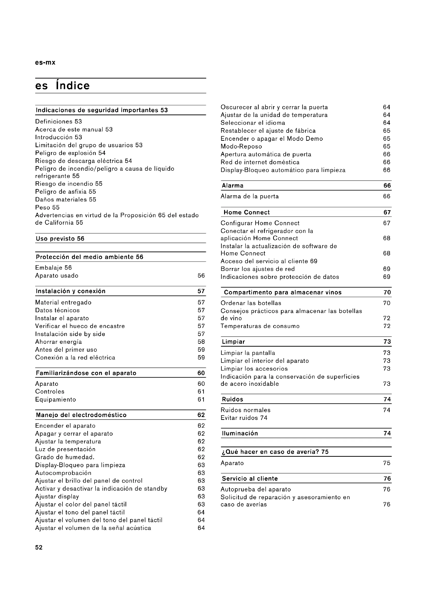 Para volver a conectar el aparato con la red doméstica WLAN (Wi-Fi), ejecute de nuevo la configuración inicial. ~ "Configuración de la conexión con la red doméstica" en la página 67 Indicaciones sobre protección de datos Al conectar por primera vez su aparato Home Connect a una red doméstica asociada a internet WLAN (Wi-Fi), el aparato transmite las siguientes categorías de datos al servidor Home Connect (registro inicial): ▯ Identificación unívoca del aparato (compuesta por la clave del aparato y la dirección MAC del módulo de comunicación Wi-Fi utilizado). ▯ Certificado de seguridad del módulo de comunicación Wi-Fi (para la protección técnica de la información de la conexión). ▯ Las versiones actuales del software y hardware del electrodoméstico. ▯ El estado de un posible restablecimiento previo a los ajustes de fábrica. El registro inicial prepara la utilización de las funciones Home Connect y solo es necesario la primera vez que se vayan a utilizar las funciones Home Connect. Nota: Tenga en cuenta que las funciones Home Connect solo se pueden utilizar en conexión con la aplicación Home Connect. Se puede consultar la información relativa a la protección de datos en la aplicación Home Connect.70 es-mx Compartimento para almacenar vinos