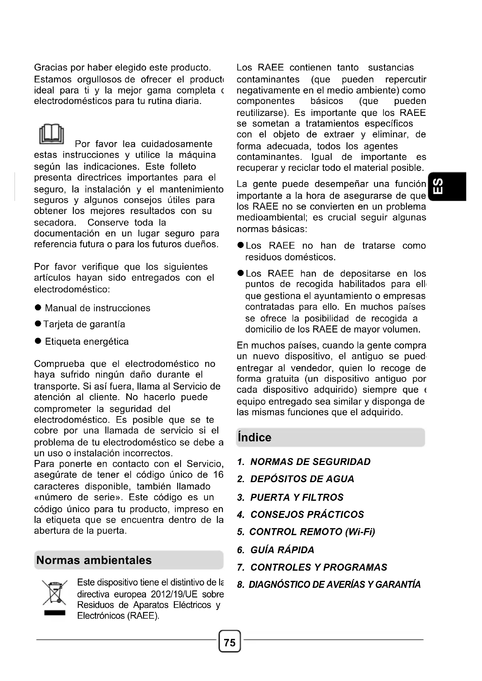 Gracias por haber elegido este producto. Estamos orgullosos de ofrecer el producto ideal para ti y la mejor gama completa de electrodomésticos para tu rutina diaria. Por favor lea cuidadosamente estas instrucciones y utilice la máquina según las indicaciones. Este folleto presenta directrices importantes para el seguro, la instalación y el mantenimiento seguros y algunos consejos útiles para obtener los mejores resultados con su secadora. Conserve toda la documentación en un lugar seguro para referencia futura o para los futuros dueños. Por favor verifique que los siguientes artículos hayan sido entregados con el electrodoméstico: ! Manual de instrucciones ! Tarjeta de garantía ! Etiqueta energética Comprueba que el electrodoméstico no haya sufrido ningún daño durante el transporte. Si así fuera, llama al Servicio de atención al cliente. No hacerlo puede comprometer la seguridad del electrodoméstico. Es posible que se te cobre por una llamada de servicio si el problema de tu electrodoméstico se debe a un uso o instalación incorrectos. Para ponerte en contacto con el Servicio, asegúrate de tener el código único de 16 caracteres disponible, también llamado «número de serie». Este código es un código único para tu producto, impreso en la etiqueta que se encuentra dentro de la abertura de la puerta.