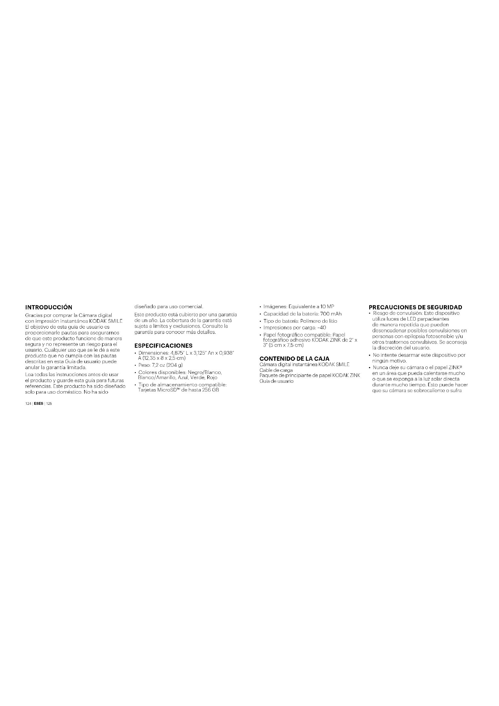 kodakphotoplus.com Die Marke, das Logo und die Handelskleidung von Kodak werden unter Lizenz der Eastman Kodak Company verwendet. Android ist eine Marke von Google Inc. IOS ist eine Marke von Cisco in den USA und anderen Ländern und wird unter Lizenz verwendet. Alle anderen Produkte, Markennamen, Firmennamen und Logos sind Warenzeichen der jeweiligen Eigentümer. Sie dienen lediglich zur Identiizierung der jeweiligen Produkte und sind nicht als Sponsoring, Bestätigung oder Genehmigung zu verstehen. Vertrieben von: C&A Marketing, Inc., 114 Tived Lane East, Edison, NJ 08837, USA C&A Marketing UK LTD, 167 Hermitage Road, Crusader Industrial Estate, London N4 1LZ, UK ©2019. Alle Rechte vorbehalten. In Vietnam hergestellt.124 | ES ES | 125 INTRODUCCIÓN Gracias por comprar la Cámara digital con impresión instantánea KODAK SMILE El objetivo de esta guía de usuario es proporcionarle pautas para asegurarnos de que este producto funcione de manera segura y no represente un riesgo para el usuario. Cualquier uso que se le dé a este producto que no cumpla con las pautas descritas en esta Guía de usuario puede anular la garantía limitada. Lea todas las instrucciones antes de usar el producto y guarde esta guía para futuras referencias. Este producto ha sido diseñado solo para uso doméstico. No ha sido diseñado para uso comercial. Este producto está cubierto por una garantía de un año. La cobertura de la garantía está sujeta a límites y exclusiones. Consulte la garantía para conocer más detalles. ESPECIFICACIONES