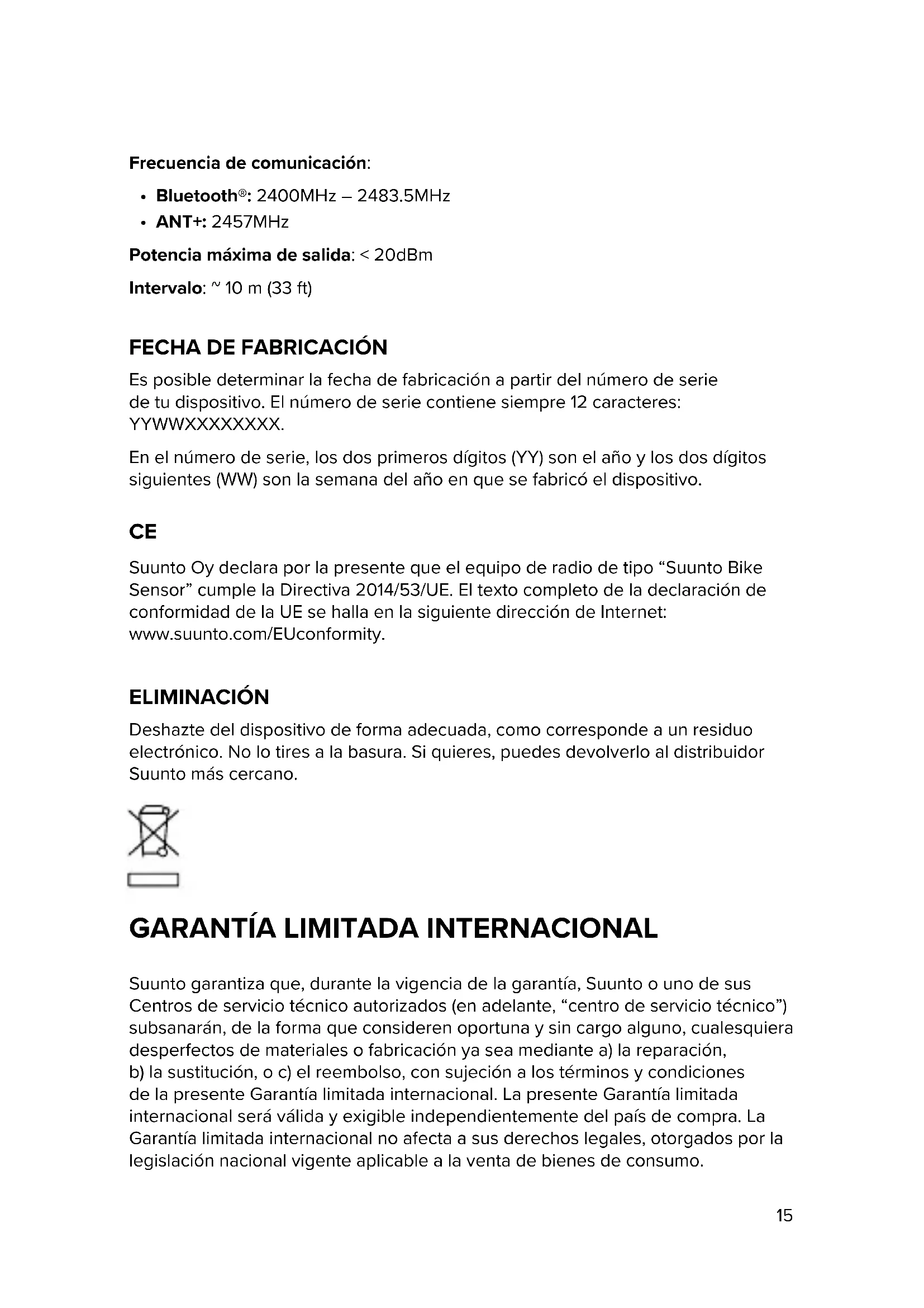 Suunto Oy declara por la presente que el equipo de radio de tipo “Suunto Bike Sensor” cumple la Directiva 2014/53/UE. El texto completo de la declaración de conformidad de la UE se halla en la siguiente dirección de Internet: www.suunto.com/EUconformity. ELIMINACIÓN Deshazte del dispositivo de forma adecuada, como corresponde a un residuo electrónico. No lo tires a la basura. Si quieres, puedes devolverlo al distribuidor Suunto más cercano.