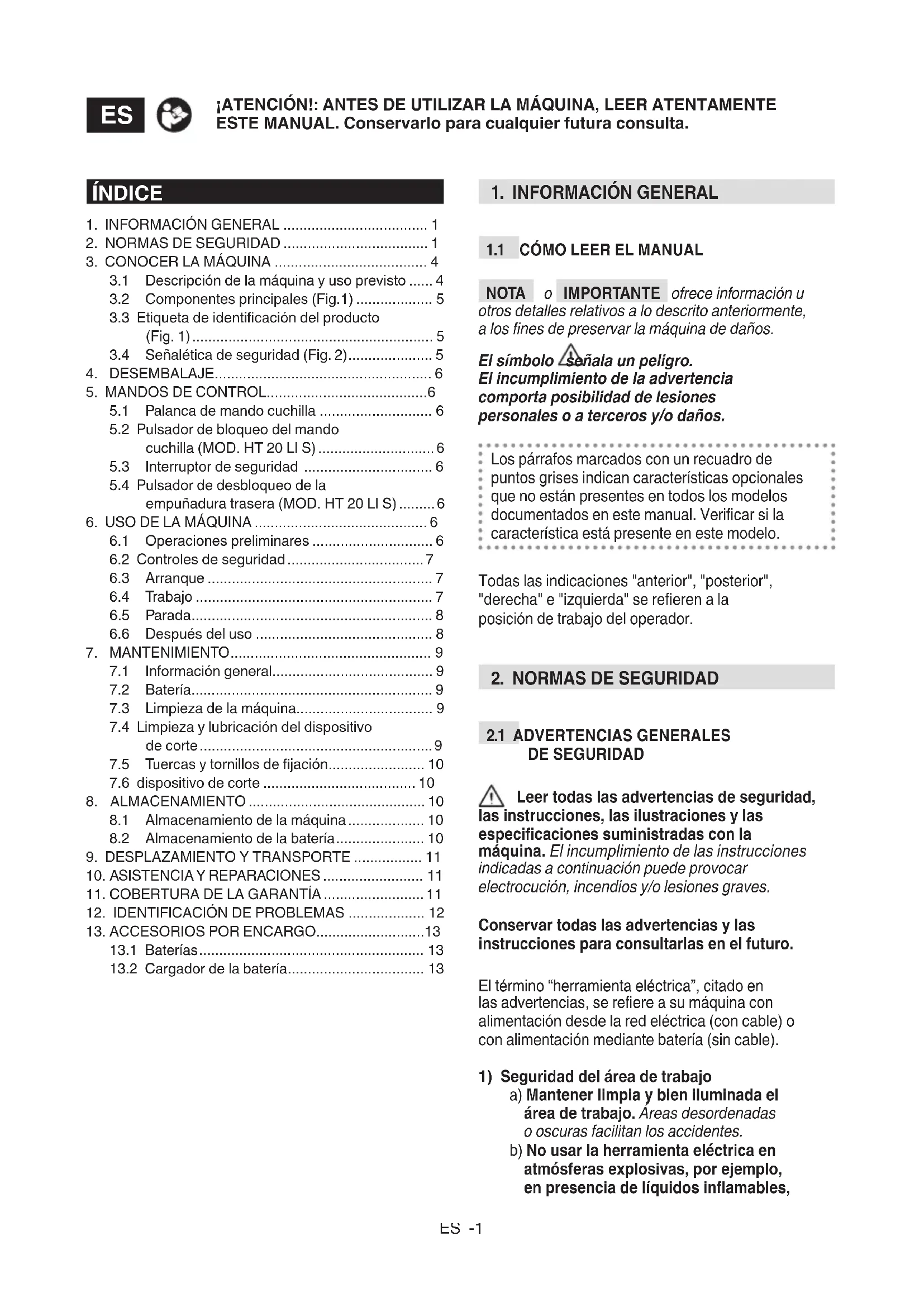 Device used to recharge the battery (Fig.19).ES -1 ¡ATENCIÓN!: ANTES DE UTILIZAR LA MÁQUINA, LEER ATENTAMENTE ESTE MANUAL. Conservarlo para cualquier futura consulta.