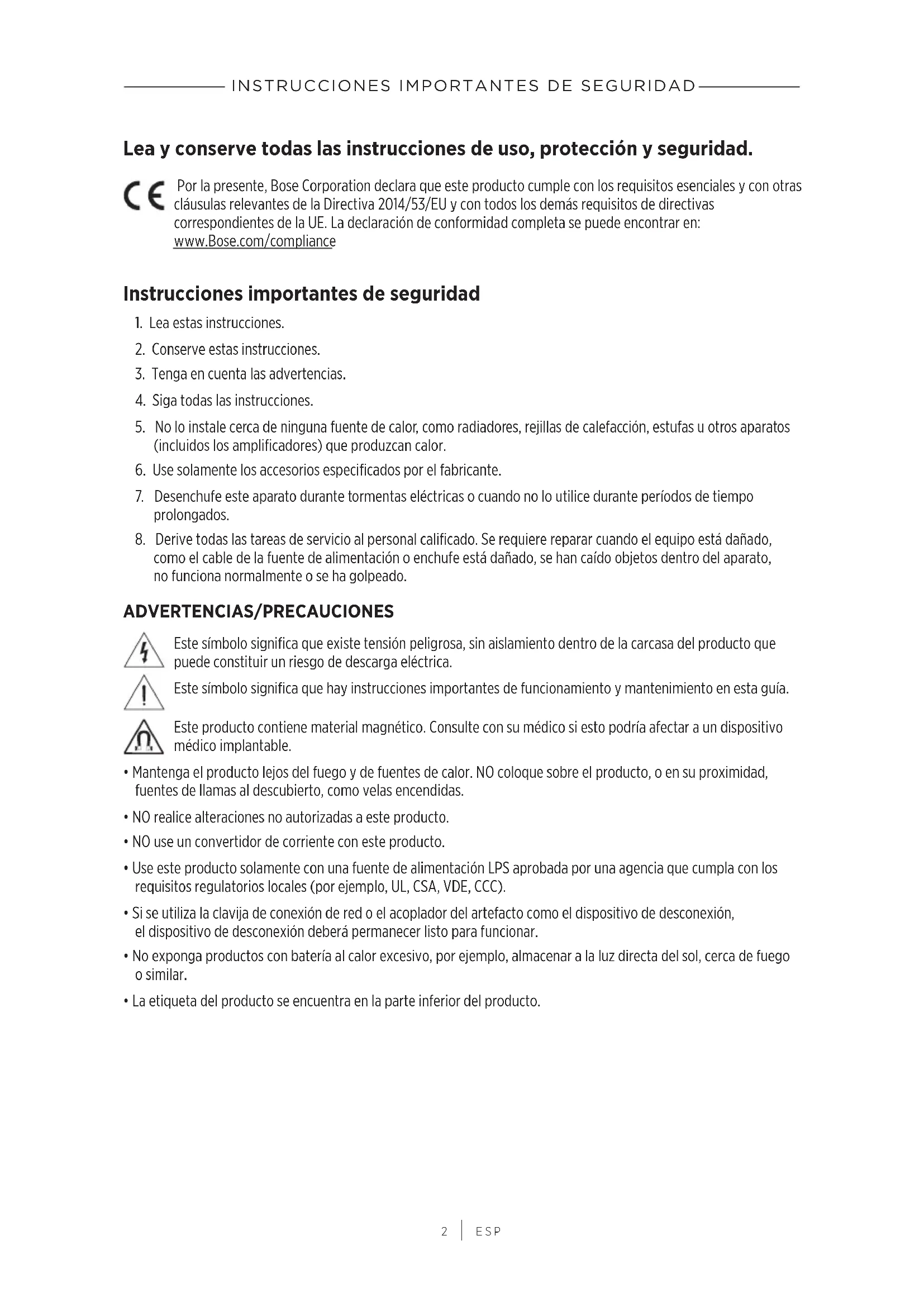 ESP Lea y conserve todas las instrucciones de uso, protección y seguridad. Por la presente, Bose Corporation declara que este producto cumple con los requisitos esenciales y con otras cláusulas relevantes de la Directiva 2014/53/EU y con todos los demás requisitos de directivas correspondientes de la UE. La declaración de conformidad completa se puede encontrar en: www.Bose.com/compliance Instrucciones importantes de seguridad