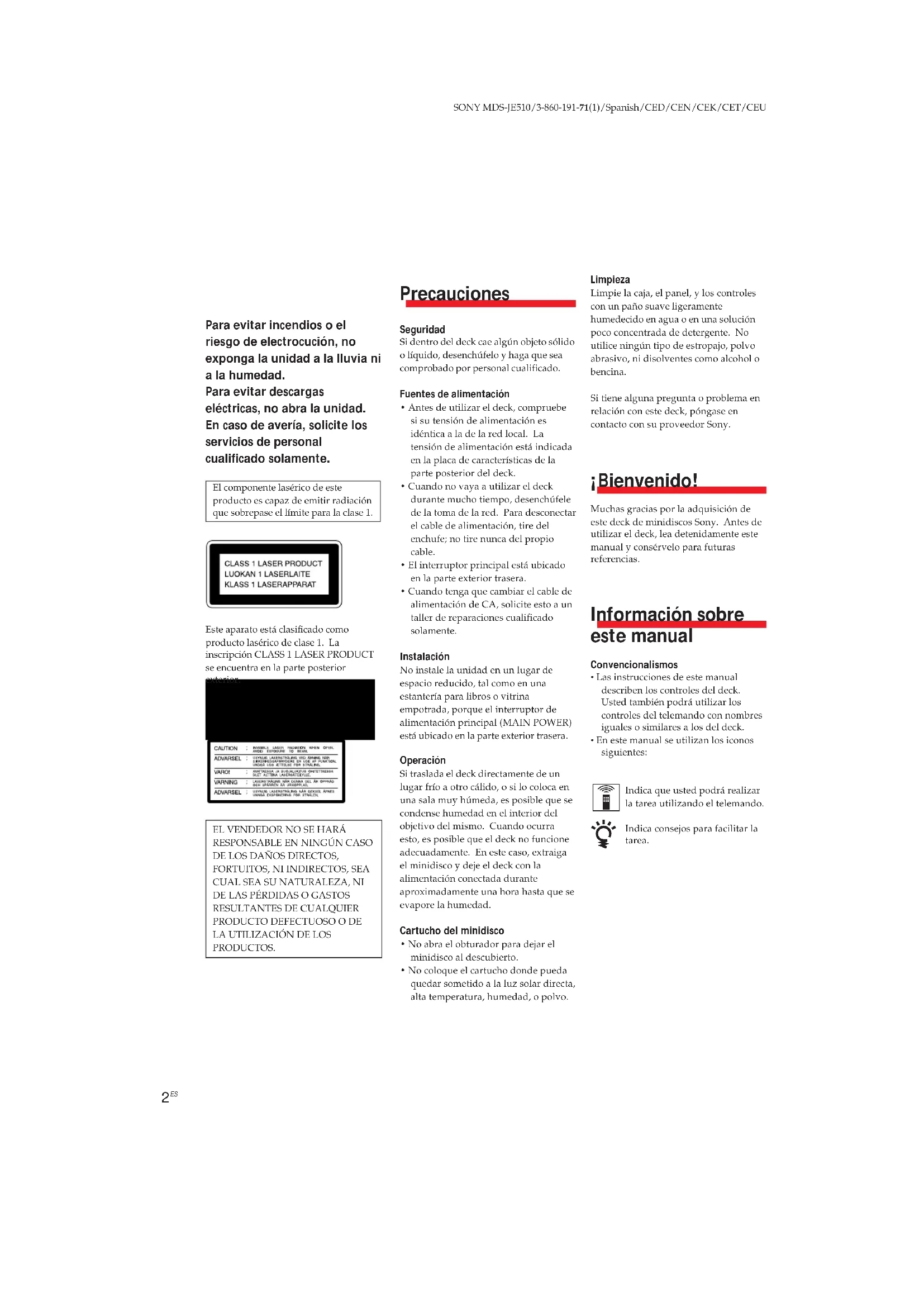 SONY MDS-JE510/3-860-191-71(1)/Spanish/CED/CEN/CEK/CET/CEU Precauciones SeguridadSi dentro del deck cae algún objeto sólidoo líquido, desenchúfelo y haga que seacomprobado por personal cualificado.Fuentes de alimentación• Antes de utilizar el deck, compruebesi su tensión de alimentación esidéntica a la de la red local. Latensión de alimentación está indicadaen la placa de características de laparte posterior del deck.• Cuando no vaya a utilizar el deckdurante mucho tiempo, desenchúfelede la toma de la red. Para desconectarel cable de alimentación, tire delenchufe; no tire nunca del propiocable.• El interruptor principal está ubicadoen la parte exterior trasera.• Cuando tenga que cambiar el cable dealimentación de CA, solicite esto a untaller de reparaciones cualificadosolamente.InstalaciónNo instale la unidad en un lugar deespacio reducido, tal como en unaestantería para libros o vitrinaempotrada, porque el interruptor dealimentación principal (MAIN POWER)está ubicado en la parte exterior trasera.OperaciónSi traslada el deck directamente de unlugar frío a otro cálido, o si lo coloca enuna sala muy húmeda, es posible que secondense humedad en el interior delobjetivo del mismo. Cuando ocurraesto, es posible que el deck no funcioneadecuadamente. En este caso, extraigael minidisco y deje el deck con laalimentación conectada duranteaproximadamente una hora hasta que seevapore la humedad.Cartucho del minidisco• No abra el obturador para dejar elminidisco al descubierto.• No coloque el cartucho donde puedaquedar sometido a la luz solar directa,alta temperatura, humedad, o polvo. ADVERTENCIA Para evitar incendios o el riesgo de electrocución, no exponga la unidad a la lluvia ni a la humedad. Para evitar descargas eléctricas, no abra la unidad. En caso de avería, solicite los servicios de personal cualificado solamente. El componente lasérico de esteproducto es capaz de emitir radiaciónque sobrepase el límite para la clase 1.Este aparato está clasificado comoproducto lasérico de clase 1. Lainscripción CLASS 1 LASER PRODUCTse encuentra en la parte posteriorexterior.En el interior del deck se encuentra laetiqueta de precaución siguiente:EL VENDEDOR NO SE HARÁRESPONSABLE EN NINGÚN CASODE LOS DAÑOS DIRECTOS,FORTUITOS, NI INDIRECTOS, SEACUAL SEA SU NATURALEZA, NIDE LAS PÉRDIDAS O GASTOSRESULTANTES DE CUALQUIERPRODUCTO DEFECTUOSO O DELA UTILIZACIÓN DE LOSPRODUCTOS.LimpiezaLimpie la caja, el panel, y los controlescon un paño suave ligeramentehumedecido en agua o en una soluciónpoco concentrada de detergente. Noutilice ningún tipo de estropajo, polvoabrasivo, ni disolventes como alcohol obencina.Si tiene alguna pregunta o problema enrelación con este deck, póngase encontacto con su proveedor Sony. ¡Bienvenido! Muchas gracias por la adquisición deeste deck de minidiscos Sony. Antes deutilizar el deck, lea detenidamente estemanual y consérvelo para futurasreferencias. Información sobre este manual Convencionalismos• Las instrucciones de este manualdescriben los controles del deck.Usted también podrá utilizar loscontroles del telemando con nombresiguales o similares a los del deck.• En este manual se utilizan los iconossiguientes: Indica que usted podrá realizarla tarea utilizando el telemando. Indica consejos para facilitar latarea.3