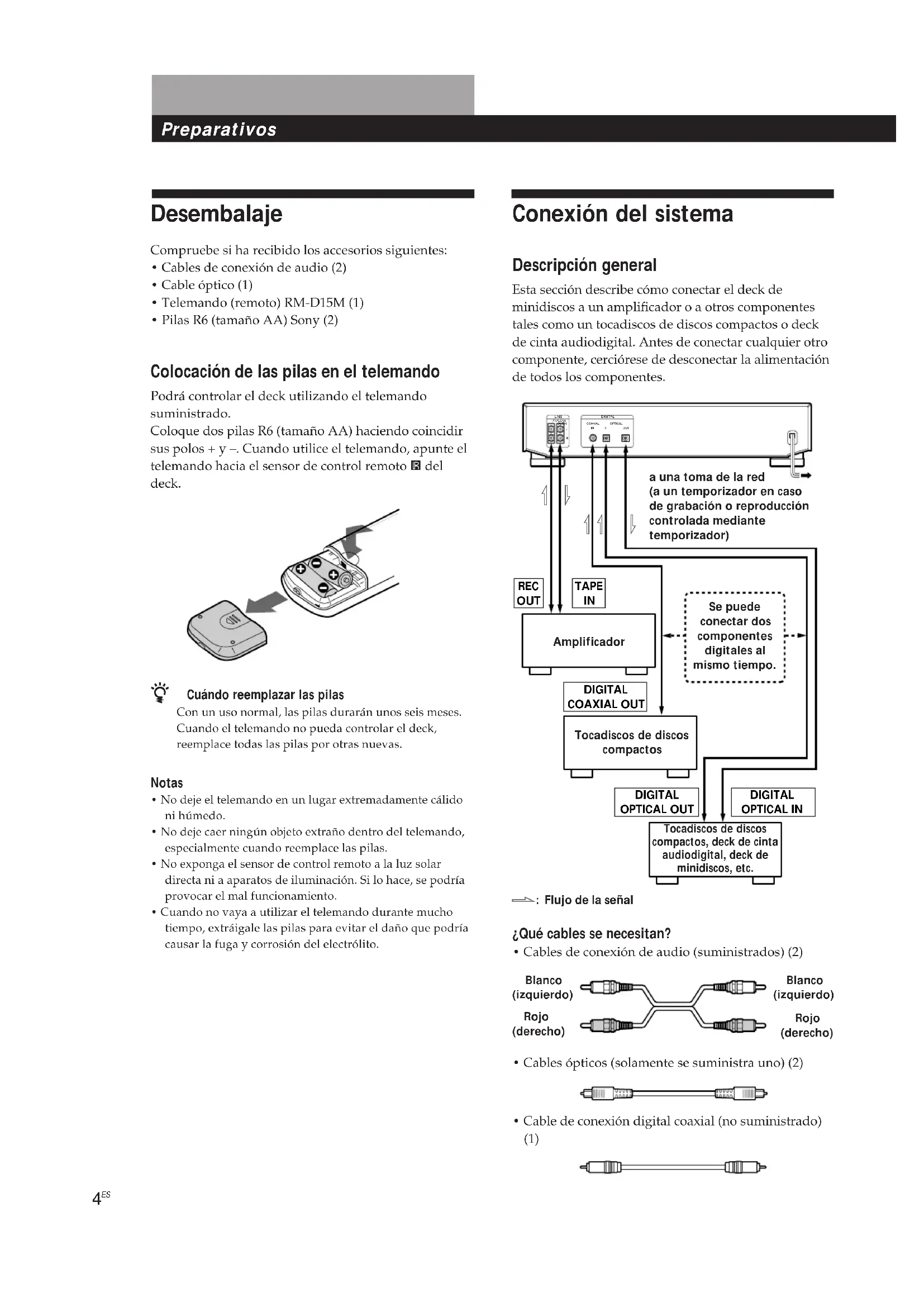 - Cable de conexión digital coaxial (no suministrado) (1) Preparativos Conexión del sistema Descripción general Esta sección describe cómo conectar el deck de minidiscos a un amplificador o a otros componentes tales como un tocadiscos de discos compactos o deck de cinta audiodigital. Antes de conectar cualquier otro componente, cerciórese de desconectar la alimentación de todos los componentes. a una toma de la red (a un temporizador en caso de grabación o reproducción controlada mediante temporizador) Amplificador Tocadiscos de discos compactos Blanco (izquierdo) Rojo (derecho) Blanco (izquierdo) Rojo (derecho) Se puede conectar dos componentes digitales al mismo tiempo.