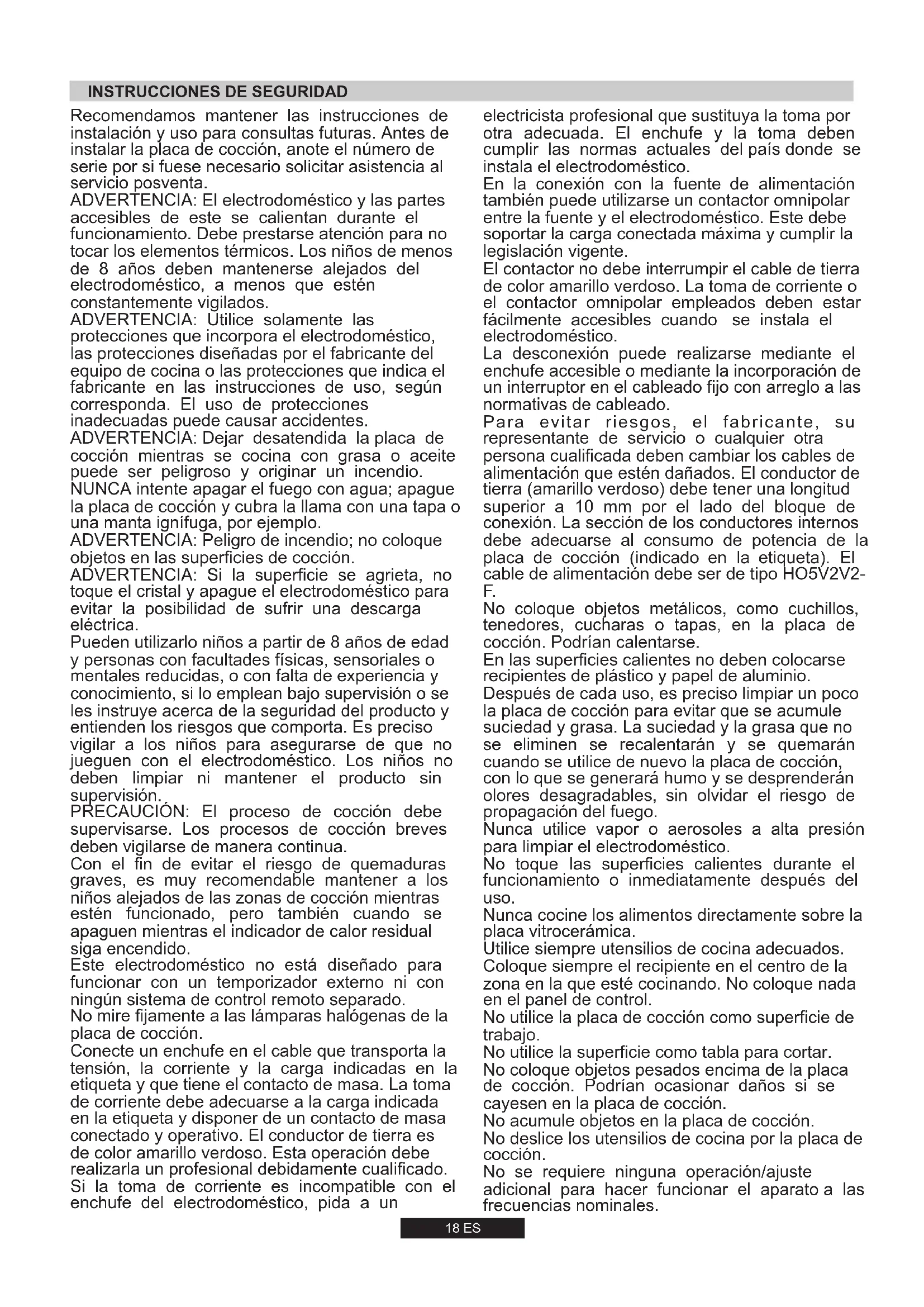 8,7 kW(NG) 8,3 kW(LPG) 829 l/h 604 g/h 220-240 V/ 50-60 Hz18 ES Recomendamos mantener las instrucciones de instalación y uso para consultas futuras. Antes de instalar la placa de cocción, anote el número de serie por si fuese necesario solicitar asistencia al servicio posventa. ADVERTENCIA: El electrodoméstico y las partes accesibles de este se calientan durante el funcionamiento. Debe prestarse atención para no tocar los elementos térmicos. Los niños de menos de 8 años deben mantenerse alejados del electrodoméstico, a menos que estén constantemente vigilados. ADVERTENCIA: Utilice solamente las protecciones que incorpora el electrodoméstico, las protecciones diseñadas por el fabricante del equipo de cocina o las protecciones que indica el fabricante en las instrucciones de uso, según corresponda. El uso de protecciones inadecuadas puede causar accidentes. ADVERTENCIA: Dejar desatendida la placa de cocción mientras se cocina con grasa o aceite puede ser peligroso y originar un incendio. NUNCA intente apagar el fuego con agua; apague la placa de cocción y cubra la llama con una tapa o una manta ignífuga, por ejemplo. ADVERTENCIA: Peligro de incendio; no coloque objetos en las superficies de cocción. ADVERTENCIA: Si la superficie se agrieta, no toque el cristal y apague el electrodoméstico para evitar la posibilidad de sufrir una descarga eléctrica. Pueden utilizarlo niños a partir de 8 años de edad y personas con facultades físicas, sensoriales o mentales reducidas, o con falta de experiencia y conocimiento, si lo emplean bajo supervisión o se les instruye acerca de la seguridad del producto y entienden los riesgos que comporta. Es preciso vigilar a los niños para asegurarse de que no jueguen con el electrodoméstico. Los niños no deben limpiar ni mantener el producto sin supervisión. PRECAUCIÓN: El proceso de cocción debe supervisarse. Los procesos de cocción breves deben vigilarse de manera continua. Con el fin de evitar el riesgo de quemaduras graves, es muy recomendable mantener a los niños alejados de las zonas de cocción mientras estén funcionado, pero también cuando se apaguen mientras el indicador de calor residual siga encendido. Este electrodoméstico no está diseñado para funcionar con un temporizador externo ni con ningún sistema de control remoto separado. No mire fijamente a las lámparas halógenas de la placa de cocción. Conecte un enchufe en el cable que transporta la tensión, la corriente y la carga indicadas en la etiqueta y que tiene el contacto de masa. La toma de corriente debe adecuarse a la carga indicada en la etiqueta y disponer de un contacto de masa conectado y operativo. El conductor de tierra es de color amarillo verdoso. Esta operación debe realizarla un profesional debidamente cualificado. Si la toma de corriente es incompatible con el enchufe del electrodoméstico, pida a un