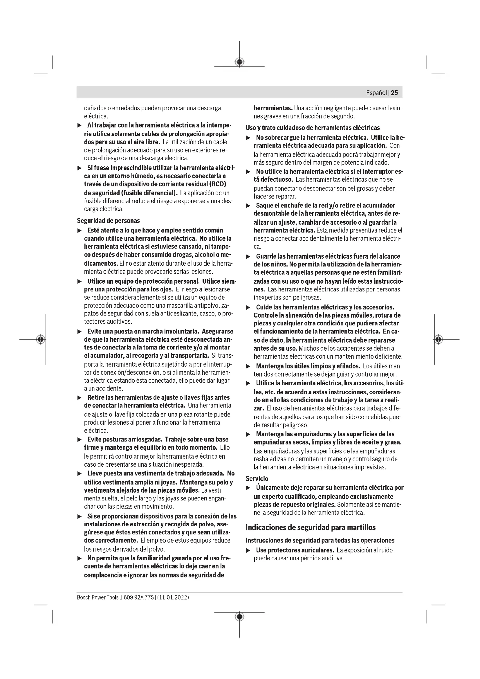 El nivel de vibraciones y el valor de emisiones de ruidos indi- cados en estas instrucciones han sido determinados según un procedimiento de medición normalizado y pueden servir como base de comparación con otras herramientas eléctri- cas. También son adecuados para estimar provisionalmente la emisión de vibraciones y ruidos. El nivel de vibraciones y el valor de emisiones de ruidos indi- cados han sido determinados para las aplicaciones principa- les de la herramienta eléctrica. Por ello, el nivel de vibracio- nes y el valor de emisiones de ruidos pueden ser diferentes si la herramienta eléctrica se utiliza para otras aplicaciones, con útiles diferentes, o si el mantenimiento de la misma fue- se deficiente. Ello puede suponer un aumento drástico de la emisión de vibraciones y de ruidos durante el tiempo total de trabajo. Para determinar con exactitud las emisiones de vibraciones y de ruidos, es necesario considerar también aquellos tiem- pos en los que el aparato esté desconectado, o bien, esté en funcionamiento, pero sin ser utilizado realmente. Ello puede suponer una disminución drástica de las emisiones de vibra- ciones y de ruidos durante el tiempo total de trabajo. Fije unas medidas de seguridad adicionales para proteger al usuario de los efectos por vibraciones, como por ejemplo: Mantenimiento de la herramienta eléctrica y de los útiles, conservar calientes las manos, organización de las secuen- cias de trabajo. Montaje u Antes de cualquier manipulación en la herramienta eléctrica, sacar el enchufe de red de la toma de co- rriente. Empuñadura adicional u Utilice su herramienta eléctrica sólo con la empuñadu- ra adicional (12). u Preste atención a que la empuñadura adicional esté siempre bien apretada. De lo contrario, podría perder el control sobre la herramienta eléctrica durante el trabajo. Girar la empuñadura adicional (verfiguraA) La empuñadura adicional (12) la puede girar a voluntad, pa- ra lograr una postura de trabajo segura y libre de fatiga. – Gire la parte inferior de la empuñadura adicional (12) en sentido antihorario y gire la empuñadura adicional (12) a la posición deseada. Luego, vuelva a apretar de nuevo la empuñadura adicional (12) en sentido horario. Observe que la abrazadera de la empuñadura adicional quede alojada en la ranura de la carcasa prevista para tal fin. Selección del portabrocas y de los útiles Para taladrar con percusión y para cincelar se precisan útiles SDS-plus, que se montan en el portabrocas SDS-plus. Para taladrar sin percusión en madera, metal, cerámica y plástico, así como para atornillar se utilizan útiles sin vástago SDS-plus (p. ej. brocas de vástago cilíndrico). Para estos úti- les se precisa un portabrocas de sujeción rápida o un porta- brocas de corona dentada. Cambio del portabrocas Montaje del portabrocas de sujeción rápida/portabrocas de corona dentada (ver figura B) – Atornille el vástago de inserción SDS-plus(17) en un por- tabrocas de sujeción rápida(1)/portabrocas de corona dentada(16). Asegure el portabrocas de sujeción rápida(1) /portabrocas de corona dentada(16) con el tornillo de seguridad(15). Observe, que el tornillo de seguridad tiene una rosca a la izquierda. Bosch Power Tools 1 609 92A 77S | (11.01.2022)28 | Español Colocación del portabrocas de sujeción rápida/ portabrocas de corona dentada (ver figura B) – Limpie primero y aplique a continuación una capa ligera de grasa al extremo del vástago de inserción SDS plus (17). – Inserte girando el portabrocas de sujeción rápida (1)/ portabrocas de corona dentada (16) con el vástago de in- serción en el portaherramientas, hasta que se bloquee automáticamente. – Tire del portabrocas de sujeción rápida (1)/portabrocas de corona dentada (16) para asegurarse de que ha que- dado correctamente sujeto. Desmontaje del portabrocas de sujeción rápida/ portabrocas de corona dentada – Empuje el casquillo de enclavamiento(5) hacia atrás y desmonte el portabrocas de sujeción rápida(1)/porta- brocas de corona dentada(16). Cambio de útil La caperuza guardapolvo (4) evita en gran medida la pene- tración de polvo de perforación en el portaútiles durante el funcionamiento. Al insertar el útil, asegúrese de que la cape- ruza guardapolvo (4) no esté dañada. u Una caperuza guardapolvo dañada debe ser reempla- zada inmediatamente. Se recomienda que este trabajo sea realizado por un servicio técnico. Cambio de útil (SDS-plus) Montaje del útil SDS-plus (ver figura C) El portaútiles SDS-plus le permite cambiar el útil de forma sencilla y cómoda sin precisar para ello una herramienta. – Limpie primero y aplique a continuación una capa ligera de grasa al extremo de inserción del útil. – Inserte girando el útil en el portaútiles de manera que éste quede sujeto automáticamente. – Tire del útil para asegurarse de que ha quedado correcta- mente sujeto. Condicionado por el sistema, el útil SDS-plus puede mover- se libremente. Por ello, en la marcha en vacío se genera una excentricidad radial. Esto no tiene repercusión sobre la pre- cisión del orificio taladrado, ya que la broca se centra por sí misma al taladrar. Desmontaje del útil SDS-plus (ver figura D) – Deslice el casquillo de enclavamiento (5) hacia detrás y saque el útil. Cambio de herramienta con portabrocas intercambiable de sujeción rápida Colocar el útil (ver figura E) Indicación: ¡No utilice el útil sin SDS-plus para el taladrado de percusión o el cincelado! Al taladrar con percusión o cin- celar ello perjudicaría a los útiles sin SDS-plus y al portabro- cas. – Coloque el portabrocas de sujeción rápida (1). – Sujete el casquillo posterior (19) del portabrocas de suje- ción rápida (1) y gire el casquillo anterior (18) en sentido antihorario, hasta que se pueda colocar el útil. Inserte el útil. – Sujete el casquillo posterior del portabrocas de sujeción rápida (1) y gire el casquillo anterior vigor