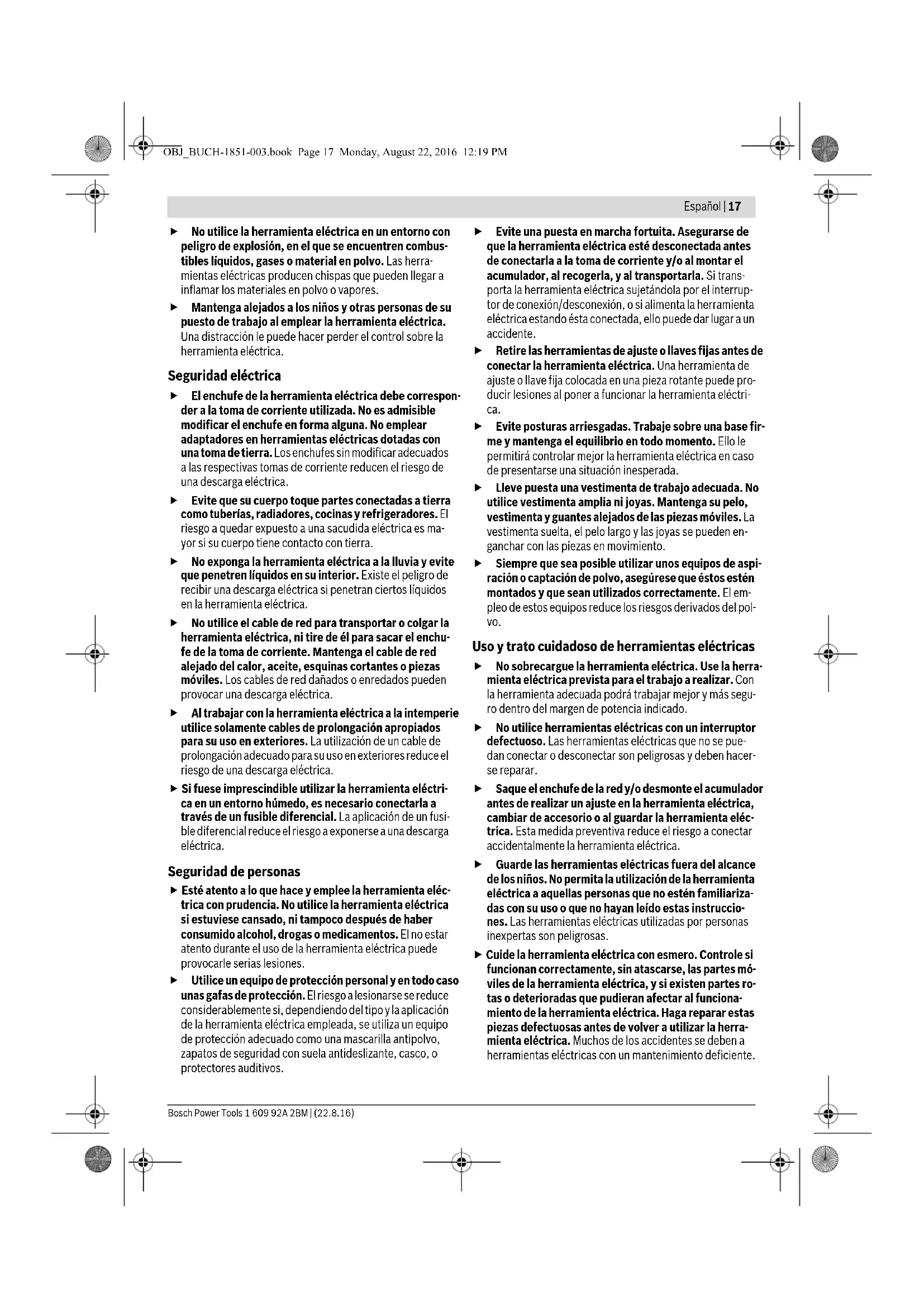 OBJ_BUCH-1851-003.book Page 15 Monday, August 22, 2016 12:19 PM16 | Español 1 609 92A 2BM | (22.8.16) Bosch Power Tools Nettoyage et entretien Veillez à ce que l’outil électroportatif ainsi que les ouïes de ventilation soient toujours propres afin d’obtenir un travail impeccable et sûr. Si le remplacement du câble d’alimentation est nécessaire, ceci ne doit être effectué que par Bosch ou une station de Ser- vice Après-Vente agréée pour outillage Bosch afin d’éviter des dangers de sécurité. Affichage service (voir figure 7, page 148) Lorsque les balais sont usés, l’appareil électroportatif s’arrête automatiquement. Ceci est indiqué environ 8 heures aupara- vant par l’allumage ou le clignotement de l’affichage service . L’appareil électroportatif doit être envoyé auprès d’un service après-vente pour y faire effectuer les travaux d’entretien (pour les adresses, voir chapitre « Service Après-Vente et Assistance »). Si l’affichage service clignote régulièrement, c’est que l’outil électroportatif est défectueux. Si tel est le cas, ne continuez pas à utiliser l’outil électroportatif et faites-le parvenir aussi- tôt à une station de Service Après-Vente. Service Après-Vente et Assistance Notre Service Après-Vente répond à vos questions concer- nant la réparation et l’entretien de votre produit et les pièces de rechange. Vous trouverez des vues éclatées ainsi que des informations concernant les pièces de rechange également sous : www.bosch-pt.com Les conseillers techniques et assistants Bosch sont à votre disposition pour répondre à vos questions concernant nos produits et leurs accessoires. Pour toute demande de renseignement ou commande de pièces de rechange, précisez-nous impérativement le numéro d’article à dix chiffres indiqué sur la plaque signalétique du produit. France Passez votre commande de pièces détachées directement en ligne sur notre site www.bosch-pt.fr. Vous êtes un utilisateur, contactez : Le Service Clientèle Bosch Outillage Electroportatif Tel. : 0811 360122 (coût d’une communication locale) Fax : (01) 49454767 E-Mail : contact.outillage-electroportatif@fr.bosch.com Vous êtes un revendeur, contactez : Robert Bosch (France) S.A.S. Service Après-Vente Electroportatif 126, rue de Stalingrad 93705 DRANCY Cédex Tel. : (01) 43119006 Fax : (01) 43119033 E-Mail : sav.outillage-electroportatif@fr.bosch.com Belgique, Luxembourg Tel. : +32 2 588 0589 Fax : +32 2 588 0595 E-Mail : outillage.gereedschap@be.bosch.com Suisse Passez votre commande de pièces détachées directement en ligne sur notre site www.bosch-pt.com/ch/fr. Tel. : (044) 8471512 Fax : (044) 8471552 E-Mail : Aftersales.Service@de.bosch.com Élimination des déchets Les outils électroportatifs, ainsi que leurs accessoires et em- ballages, doivent pouvoir suivre chacun une voie de recyclage appropriée. Ne jetez pas les outils électroportatifs avec les ordures ménagères ! Seulement pour les pays de l’Union Européenne : Conformément à la directive européenne 2012/19/UE relative aux déchets d’équipe- ments électriques et électroniques et sa mise en vigueur conformément aux législa- tions nationales, les outils électroportatifs dont on ne peut plus se servir doivent être isolés et suivre une voie de recyclage appro- priée. Sous réserve de modifications. Español Advertencias de peligro generales para herramientas eléctricas Lea íntegramente estas adverten- cias de peligro e instrucciones. En caso de no atenerse a las advertencias de peligro e instruccio- nes siguientes, ello puede ocasionar una descarga eléctrica, un incendio y/o lesión grave. Guardar todas las advertencias de peligro e instrucciones para futuras consultas. El término herramienta eléctrica empleado en las siguientes advertencias de peligro se refiere a herramientas eléctricas de conexión a la red (con cable de red) y a herramientas eléc- tricas accionadas por acumulador (o sea, sin cable de red). Seguridad del puesto de trabajo Mantenga limpio y bien iluminado su puesto de trabajo. El desorden o una iluminación deficiente en las áreas de trabajo pueden provocar accidentes. ADVERTENCIA OBJ_BUCH-1851-003.book Page 16 Monday, August 22, 2016 12:19 PMEspañol | 17 Bosch Power Tools 1 609 92A 2BM | (22.8.16) No utilice la herramienta eléctrica en un entorno con peligro de explosión, en el que se encuentren combus- tibles líquidos, gases o material en polvo. Las herra- mientas eléctricas producen chispas que pueden llegar a inflamar los materiales en polvo o vapores. Mantenga alejados a los niños y otras personas de su puesto de trabajo al emplear la herramienta eléctrica. Una distracción le puede hacer perder el control sobre la herramienta eléctrica. Seguridad eléctrica El enchufe de la herramienta eléctrica debe correspon- der a la toma de corriente utilizada. No es admisible modificar el enchufe en forma alguna. No emplear adaptadores en herramientas eléctricas dotadas con una toma de tierra. Los enchufes sin modificar adecuados a las respectivas tomas de corriente reducen el riesgo de una descarga eléctrica. Evite que su cuerpo toque partes conectadas a tierra como tuberías, radiadores, cocinas y refrigeradores. El riesgo a quedar expuesto a una sacudida eléctrica es ma- yor si su cuerpo tiene contacto con tierra. No exponga la herramienta eléctrica a la lluvia y evite que penetren líquidos en su interior. Existe el peligro de recibir una descarga eléctrica si penetran ciertos líquidos en la herramienta eléctrica. No utilice el cable de red para transportar o colgar la herramienta eléctrica, ni tire de él para sacar el enchu- fe de la toma de corriente. Mantenga el cable de red alejado del calor, aceite, esquinas cortantes o piezas móviles. Los cables de red dañados o enredados pueden provocar una descarga eléctrica. Al trabajar con la herramienta eléctrica a la intemperie utilice solamente cables de prolo