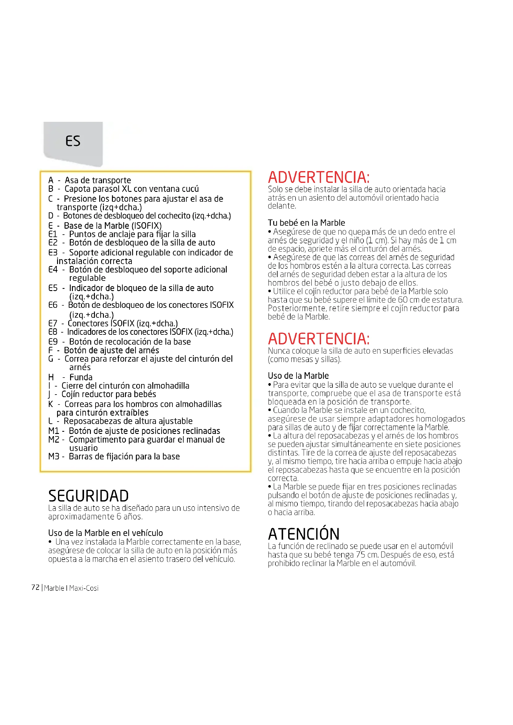 - La Marble se puede fijar en tres posiciones reclinadas pulsando el botón de ajuste de posiciones reclinadas y, al mismo tiempo, tirando del reposacabezas hacia abajo o hacia arriba. ATENCIÓN La función de reclinado se puede usar en el automóvil hasta que su bebé tenga 75 cm. Después de eso, está prohibido reclinar la Marble en el automóvil. A - Asa de transporte B - Capota parasol XL con ventana cucú C - Presione los botones para ajustar el asa de transporte (izq+dcha.) D - Botones de desbloqueo del cochecito (izq.+dcha.) E - Base de la Marble (ISOFIX) E1 - Puntos de anclaje para fijar la silla E2 - Botón de desbloqueo de la silla de auto E3 - Soporte adicional regulable con indicador de instalación correcta E4 - Botón de desbloqueo del soporte adicional regulable E5 - Indicador de bloqueo de la silla de auto (izq.+dcha.) E6 - Botón de desbloqueo de los conectores ISOFIX (izq.+dcha.) E7 - Conectores ISOFIX (izq.+dcha.) E8 - Indicadores de los conectores ISOFIX (izq.+dcha.) E9 - Botón de recolocación de la base F - Botón de ajuste del arnés G - Correa para reforzar el ajuste del cinturón del arnés H - Funda I - Cierre del cinturón con almohadilla J - Cojín reductor para bebés K - Correas para los hombros con almohadillas para cinturón extraíbles L - Reposacabezas de altura ajustable M1 - Botón de ajuste de posiciones reclinadas M2 - Compartimento para guardar el manual de usuario M3 - Barras de fijación para la baseMaxi-Cosi
