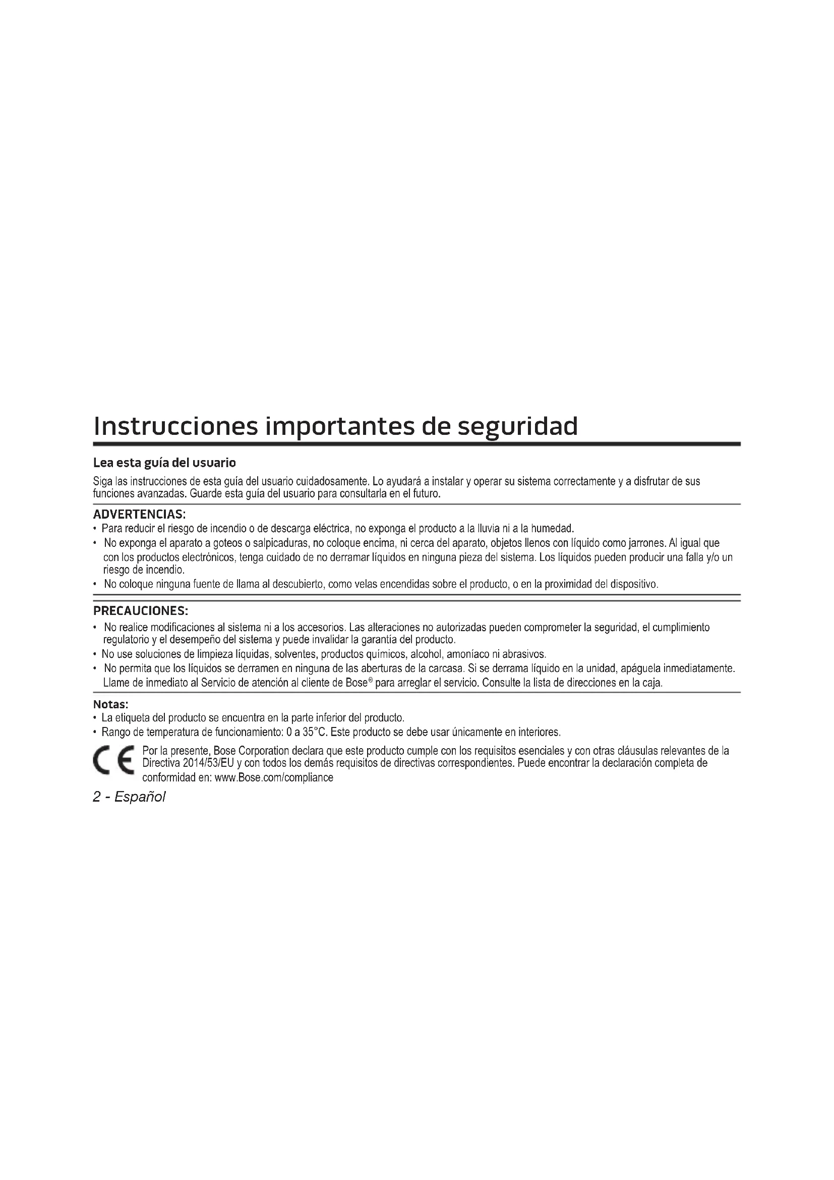 - Rango de temperatura de funcionamiento: 0 a 35°C. Este producto se debe usar únicamente en interiores. Por la presente, Bose Corporation declara que este producto cumple con los requisitos esenciales y con otras cláusulas relevantes de la Directiva 2014/53/EU y con todos los demás requisitos de directivas correspondientes. Puede encontrar la declaración completa de conformidad en: www.Bose.com/compliance Instrucciones importantes de seguridadEspañol - 3 Para cumplir con los requisitos de exposición a radiación de RF de la FCC y de la Industry Canada, este dispositivo se debe instalar de manera que las personas se encuentren a una distancia de 20 cm. No se debe coubicar ni operar conjuntamente con ninguna otra antena o transmisor. Este producto cumple con las especificaciones canadienses ICES-003 Clase B y RSS-210. Solo en EE.UU., este producto cumple con las especificaciones CFR 47 Parte 15. Este dispositivo cumple con las normas RSS sin licencia de la Industry Canada. Su uso está sujeto a las siguientes dos condiciones: (1) Este dispositivo no debe provocar interferencias dañinas y (2) Este dispositivo debe aceptar cualquier interferencia recibida, incluidas interferencias que puedan provocar un funcionamiento no deseado. Nota: Este equipo ha sido sometido a prueba y se ha comprobado que cumple con los límites de un dispositivo digital Clase B, conforme a la Parte 15 de las reglas de la FCC. Estos límites están diseñados para ofrecer una protección razonable contra la interferencia perjudicial en una instalación domiciliaria. Este equipo genera, usa y puede irradiar energía de radiofrecuencia y, si no se instala y se usa conforme a las instrucciones, puede causar una interferencia perjudicial a las comunicaciones de radio. Sin embargo, no se garantiza que la interferencia no se produzca en una instalación en particular. Si este equipo causa interferencias perjudiciales en la recepción de radio o televisión, que se puede determinar al apagar y encender el equipo, se aconseja al usuario intentar corregir la interferencia mediante una o más de las siguientes medidas: