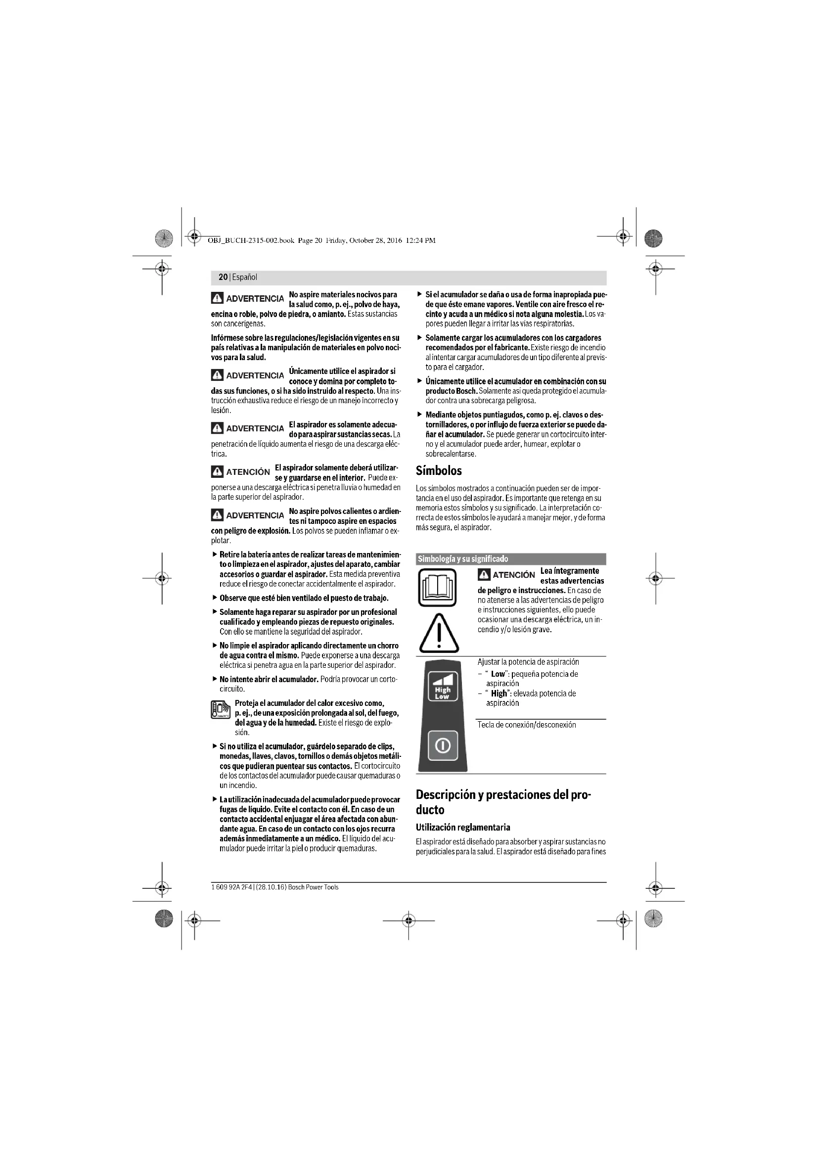 Mediante objetos puntiagudos, como p. ej. clavos o des- tornilladores, o por influjo de fuerza exterior se puede da- ñar el acumulador. Se puede generar un cortocircuito inter- no y el acumulador puede arder, humear, explotar o sobrecalentarse. Símbolos Los símbolos mostrados a continuación pueden ser de impor- tancia en el uso del aspirador. Es importante que retenga en su memoria estos símbolos y su significado. La interpretación co- rrecta de estos símbolos le ayudará a manejar mejor, y de forma más segura, el aspirador. Descripción y prestaciones del pro- ducto Utilización reglamentaria El aspirador está diseñado para absorber y aspirar sustancias no perjudiciales para la salud. El aspirador está diseñado para fines ADVERTENCIA ADVERTENCIA ADVERTENCIA ATENCIÓN ADVERTENCIA Simbología y su significado Lea íntegramente estas advertencias de peligro e instrucciones. En caso de no atenerse a las advertencias de peligro e instrucciones siguientes, ello puede ocasionar una descarga eléctrica, un in- cendio y/o lesión grave. Ajustar la potencia de aspiración –“Low”: pequeña potencia de aspiración –“High”: elevada potencia de aspiración Tecla de conexión/desconexión ATENCIÓN OBJ_BUCH-2315-002.book Page 20 Friday, October 28, 2016 12:24 PMEspañol | 21 Bosch Power Tools 1 609 92A 2F4 | (28.10.16) industriales, p. ej. para hoteles, escuelas, fábricas, tiendas, ofi- cinas y arrendamientos. Únicamente utilice el aspirador si conoce y domina por completo todas sus funciones, o si ha sido instruido al respecto. Componentes principales La numeración de los componentes está referida a la imagen del aspirador en la página ilustrada.