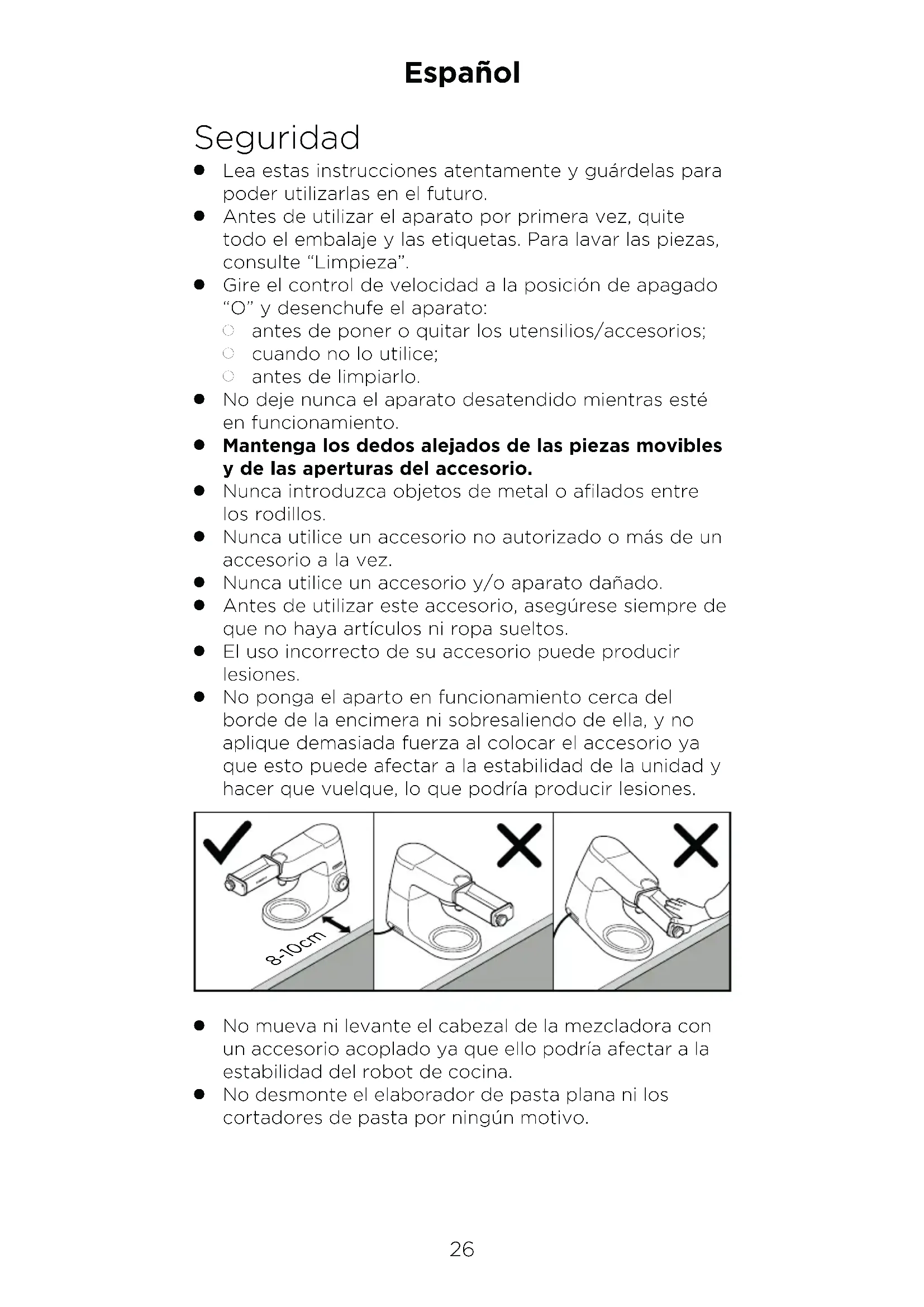 No ponga el aparto en funcionamiento cerca del borde de la encimera ni sobresaliendo de ella, y no aplique demasiada fuerza al colocar el accesorio ya que esto puede afectar a la estabilidad de la unidad y hacer que vuelque, lo que podría producir lesiones. 8-10cm