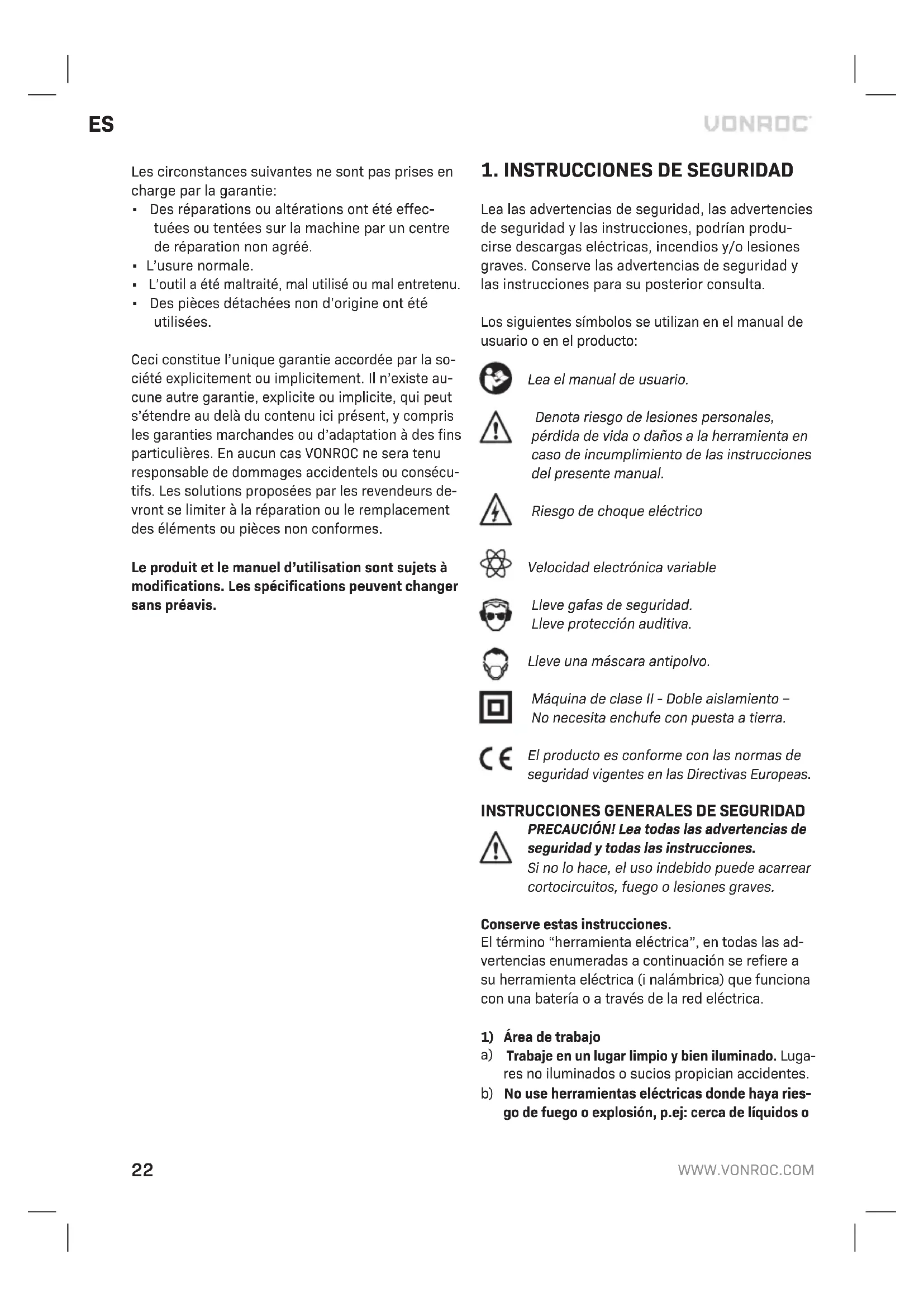 Los productos VONROC han sido desarrollados con los mas altos estandares de calidad y VONROC garantiza que estan exentos de defectos relaciona- dos con los materiales y la fabricacion durante el pe- riodo legalmente estipulado, a contar desde la fecha de compra original. En caso de que el producto presente defectos relacionados con los materiales y/o la fabricacion durante este periodo, pongase directamente en contacto VONROC. La presente garantia se excluye en los siguientes casos: