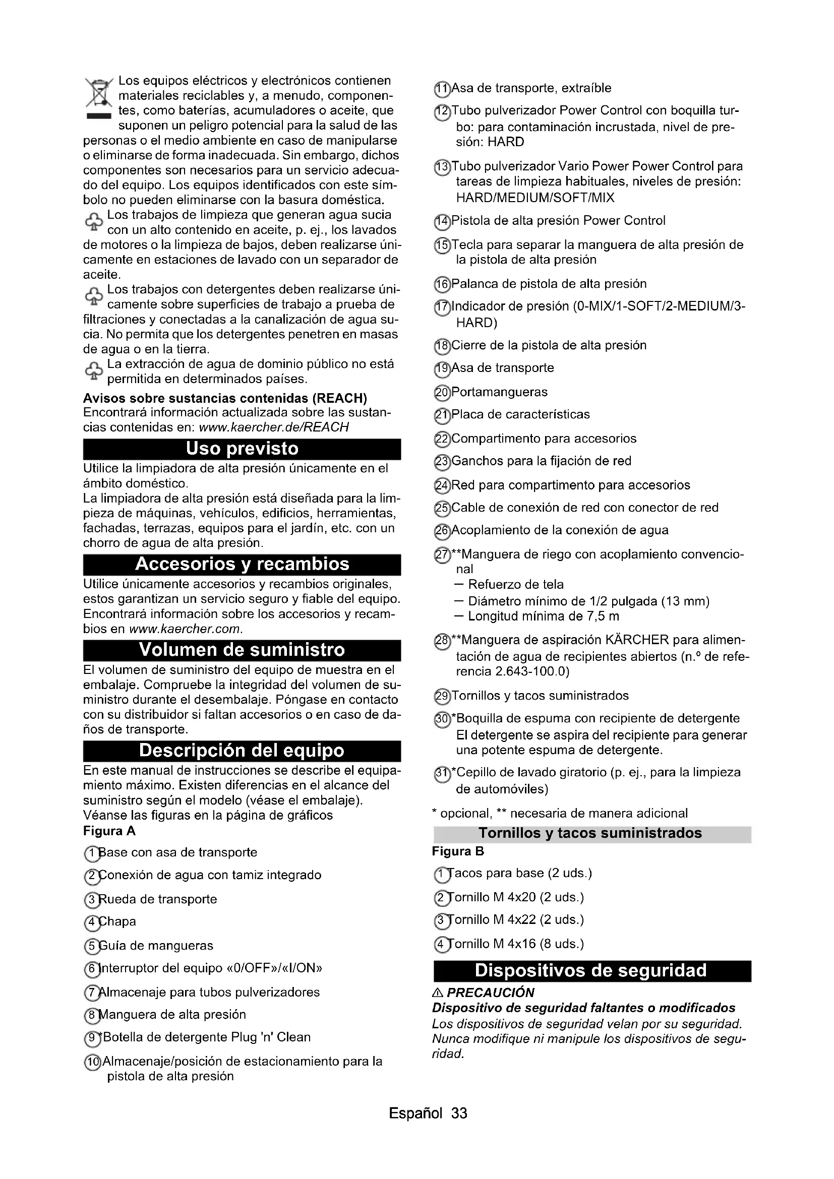 • Declaración de conformidad UE Español 33 Los equipos eléctricos y electrónicos contienen materiales reciclables y, a menudo, componen- tes, como baterías, acumuladores o aceite, que suponen un peligro potencial para la salud de las personas o el medio ambiente en caso de manipularse o eliminarse de forma inadecuada. Sin embargo, dichos componentes son necesarios para un servicio adecua- do del equipo. Los equipos identificados con este sím- bolo no pueden eliminarse con la basura doméstica. Los trabajos de limpieza que generan agua sucia con un alto contenido en aceite, p. ej., los lavados de motores o la limpieza de bajos, deben realizarse úni- camente en estaciones de lavado con un separador de aceite. Los trabajos con detergentes deben realizarse úni- camente sobre superficies de trabajo a prueba de filtraciones y conectadas a la canalización de agua su- cia. No permita que los detergentes penetren en masas de agua o en la tierra. La extracción de agua de dominio público no está permitida en determinados países. Avisos sobre sustancias contenidas (REACH) Encontrará información actualizada sobre las sustan- cias contenidas en: www.kaercher.de/REACH Uso previsto Utilice la limpiadora de alta presión únicamente en el ámbito doméstico. La limpiadora de alta presión está diseñada para la lim- pieza de máquinas, vehículos, edificios, herramientas, fachadas, terrazas, equipos para el jardín, etc. con un chorro de agua de alta presión. Accesorios y recambios Utilice únicamente accesorios y recambios originales, estos garantizan un servicio seguro y fiable del equipo. Encontrará información sobre los accesorios y recam- bios en www.kaercher.com. Volumen de suministro El volumen de suministro del equipo de muestra en el embalaje. Compruebe la integridad del volumen de su- ministro durante el desembalaje. Póngase en contacto con su distribuidor si faltan accesorios o en caso de da- ños de transporte. Descripción del equipo En este manual de instrucciones se describe el equipa- miento máximo. Existen diferencias en el alcance del suministro según el modelo (véase el embalaje). Véanse las figuras en la página de gráficos Figura A 1 Base con asa de transporte 2 Conexión de agua con tamiz integrado 3 Rueda de transporte 4 Chapa 5 Guía de mangueras 6 Interruptor del equipo «0/OFF»/«I/ON» 7 Almacenaje para tubos pulverizadores 8 Manguera de alta presión 9 *Botella de detergente Plug 'n' Clean 10 Almacenaje/posición de estacionamiento para la pistola de alta presión 11 Asa de transporte, extraíble 12 Tubo pulverizador Power Control con boquilla tur- bo: para contaminación incrustada, nivel de pre- sión: HARD 13 Tubo pulverizador Vario Power Power Control para tareas de limpieza habituales, niveles de presión: p. 37