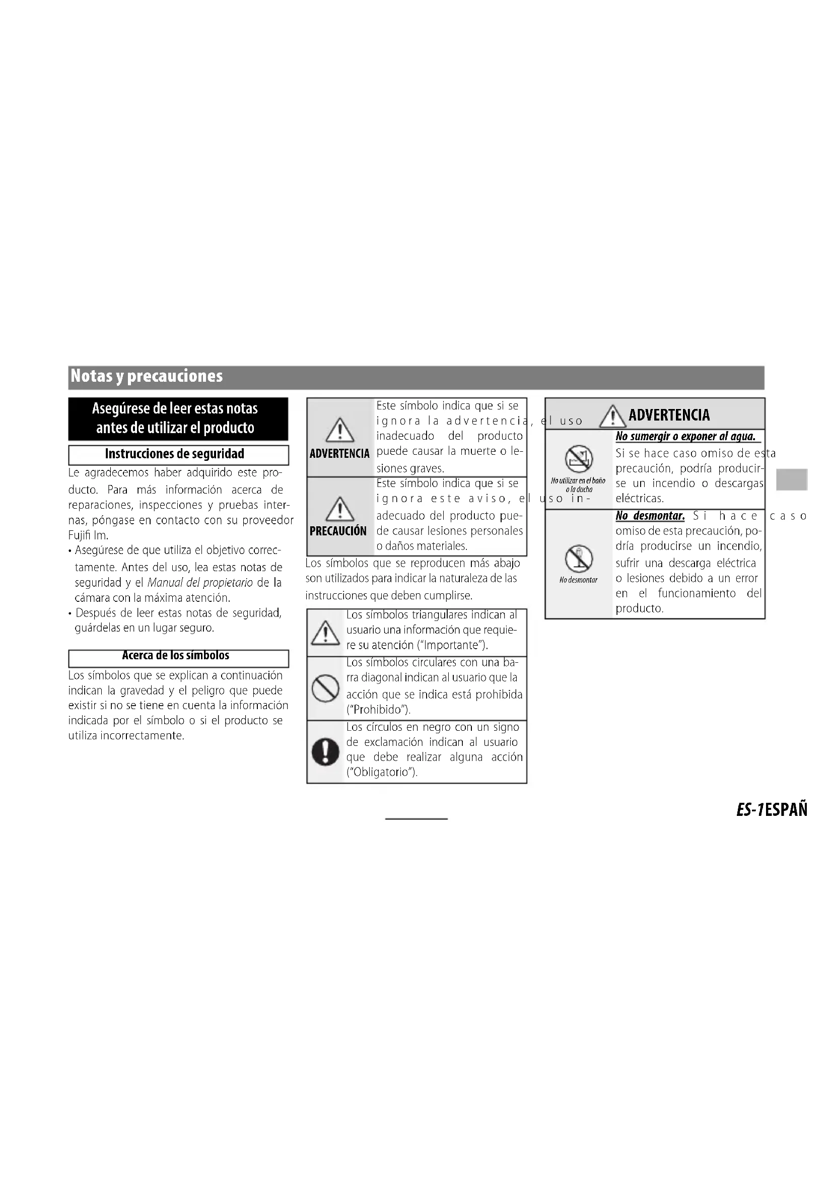 ADVERTENCIA ADVERTENCIA No utilizar en el baño o la ducha No sumergir o exponer al agua. Si se hace caso omiso de esta precaución, podría producir- se un incendio o descargas eléctricas. No desmontar No desmontar. Si hace caso omiso de esta precaución, po- dría producirse un incendio, sufrir una descarga eléctrica o lesiones debido a un error en el funcionamiento del producto.ES-2 ESPAÑOL